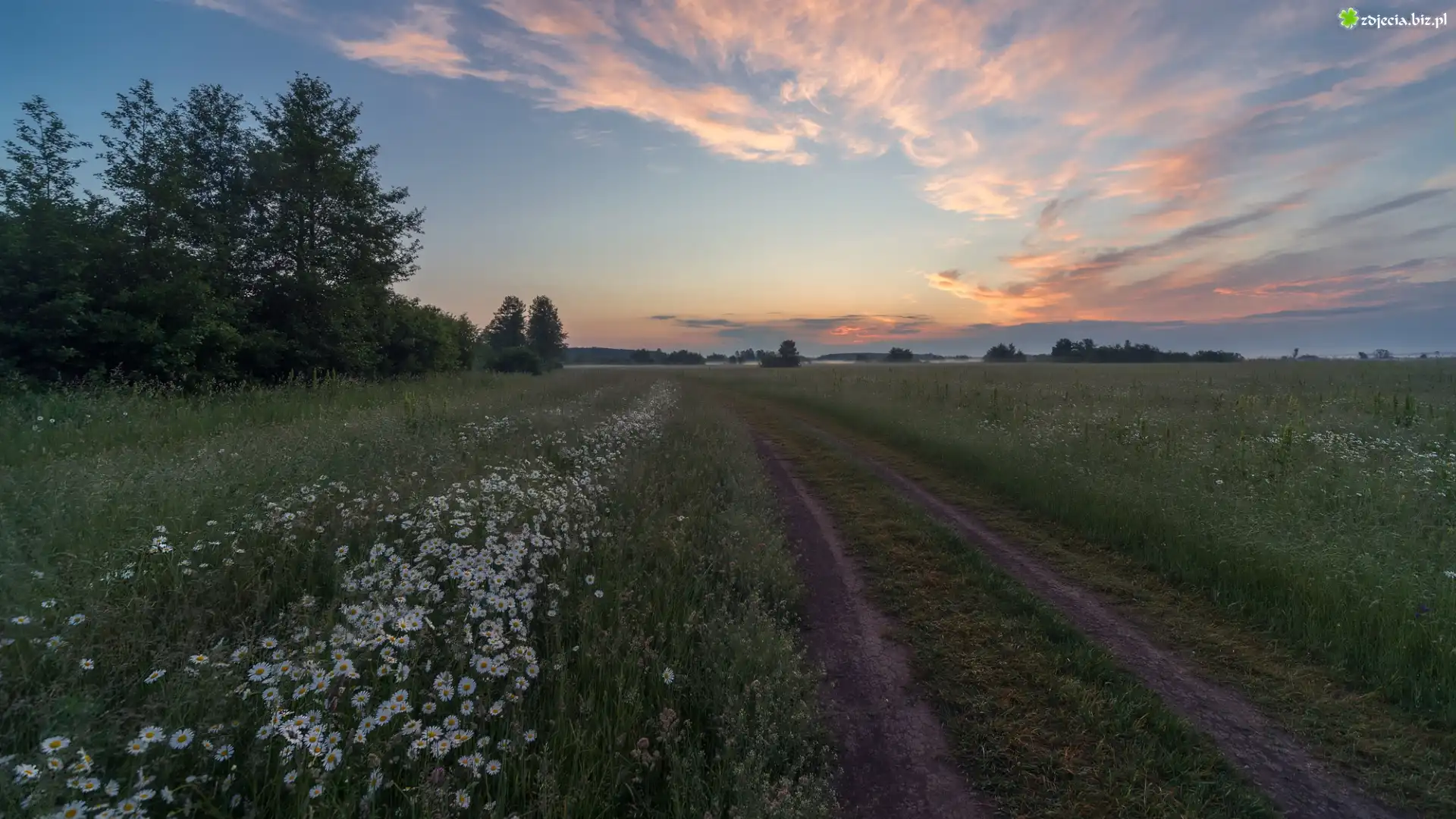 Zdjęcie Łąki, Wschód słońca, Droga, Drzewa