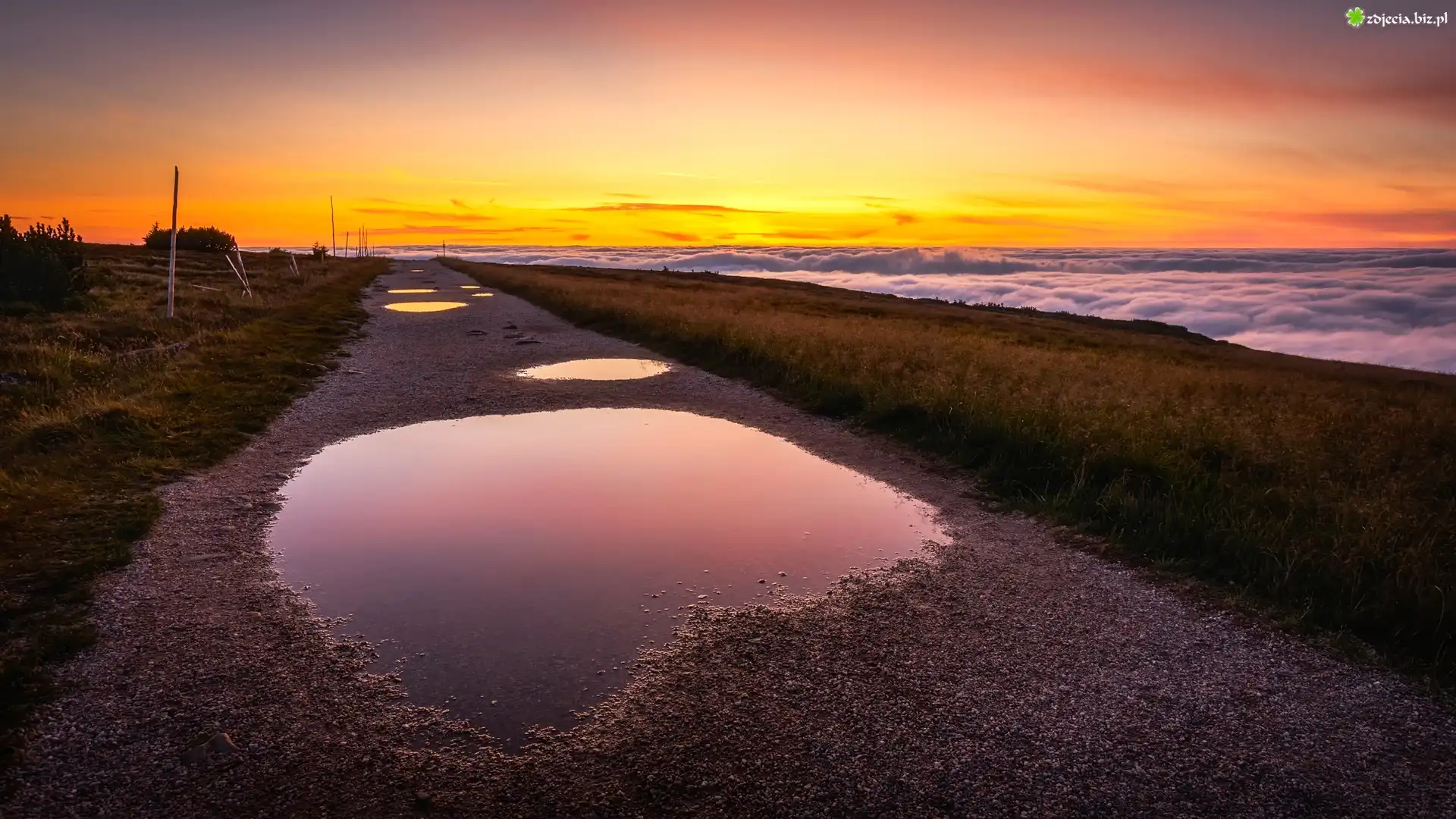 Zdjęcie Droga, Kałuże, Chmury, Zachód słońca
