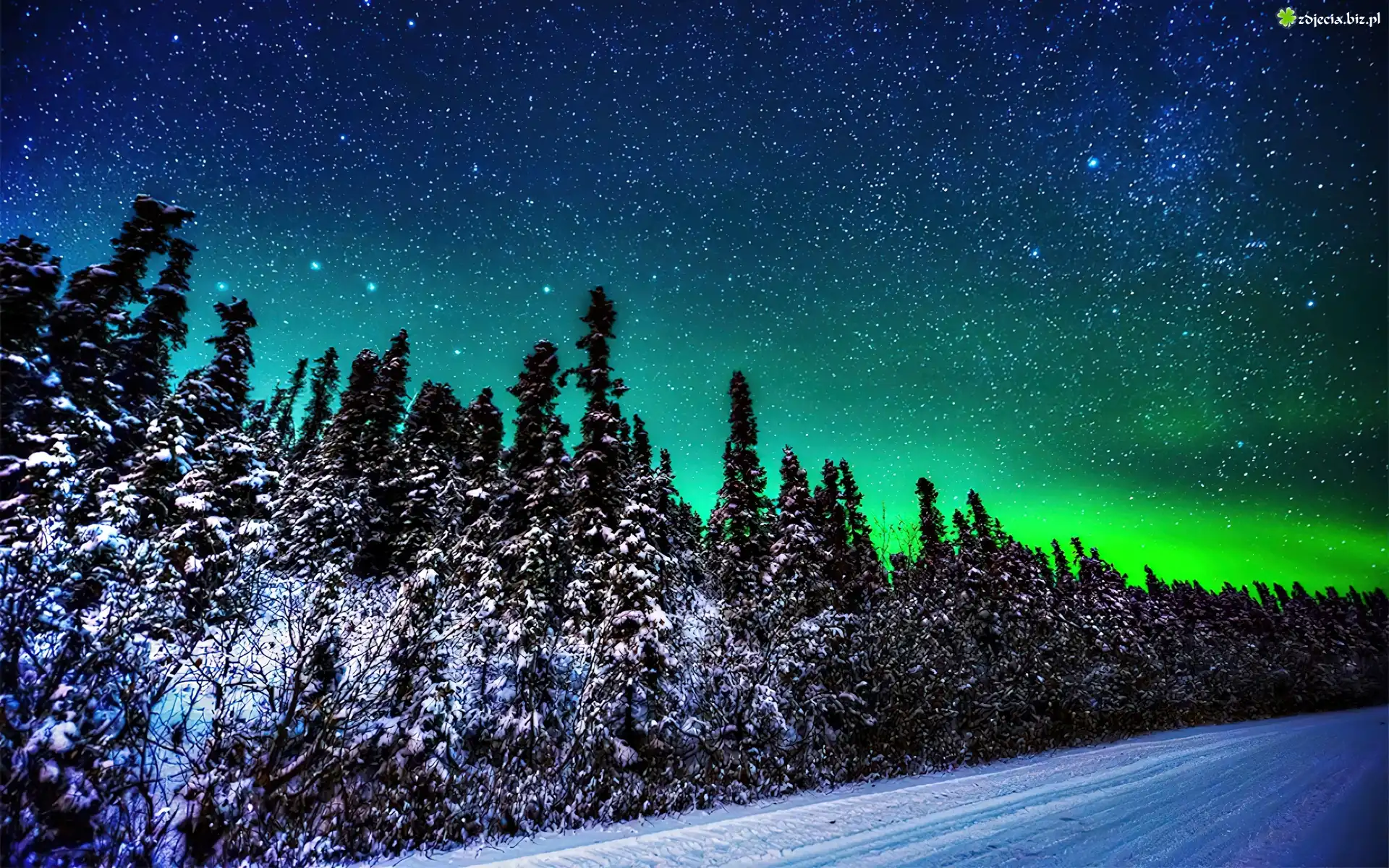 Zdjęcie Droga, Drzewa, Zorza, Polarna
