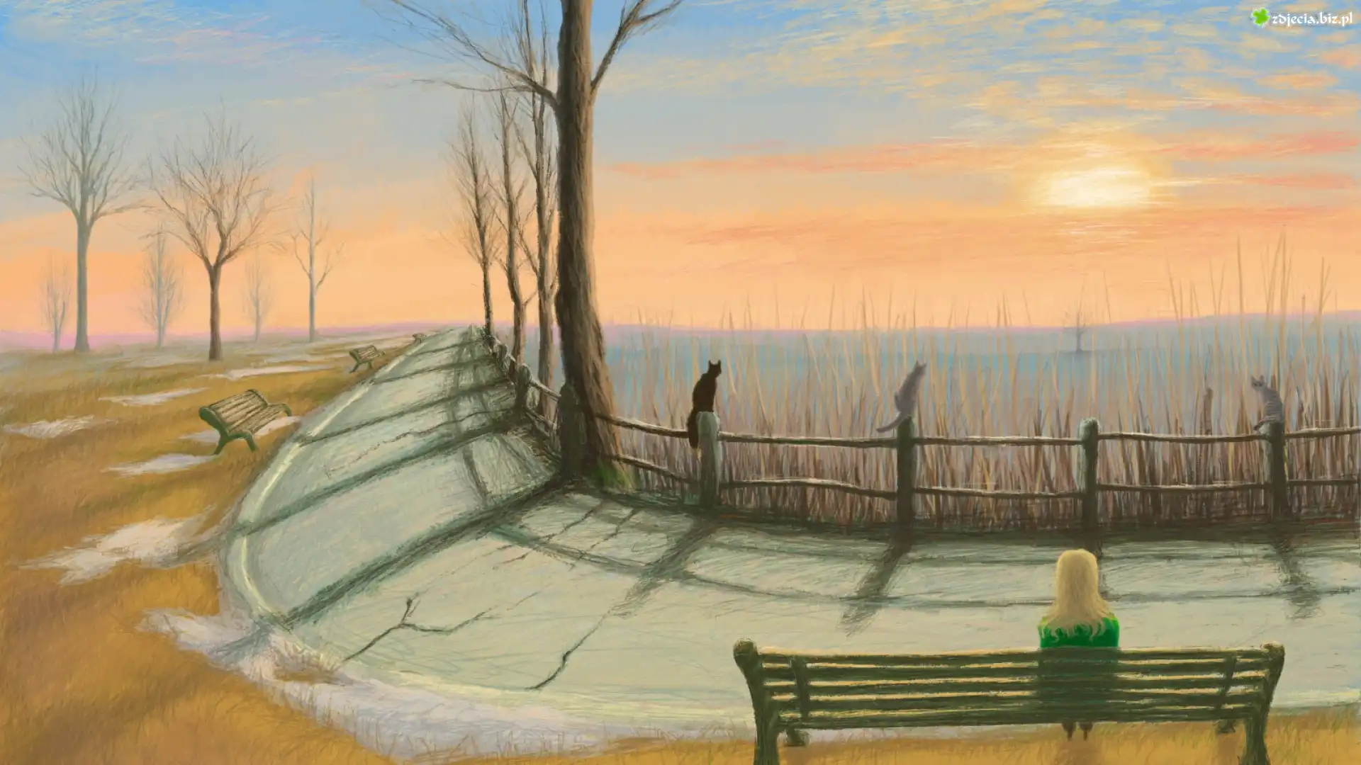 Zdjęcie Dróżka, Ławki, Koty, Płot, Drzewa