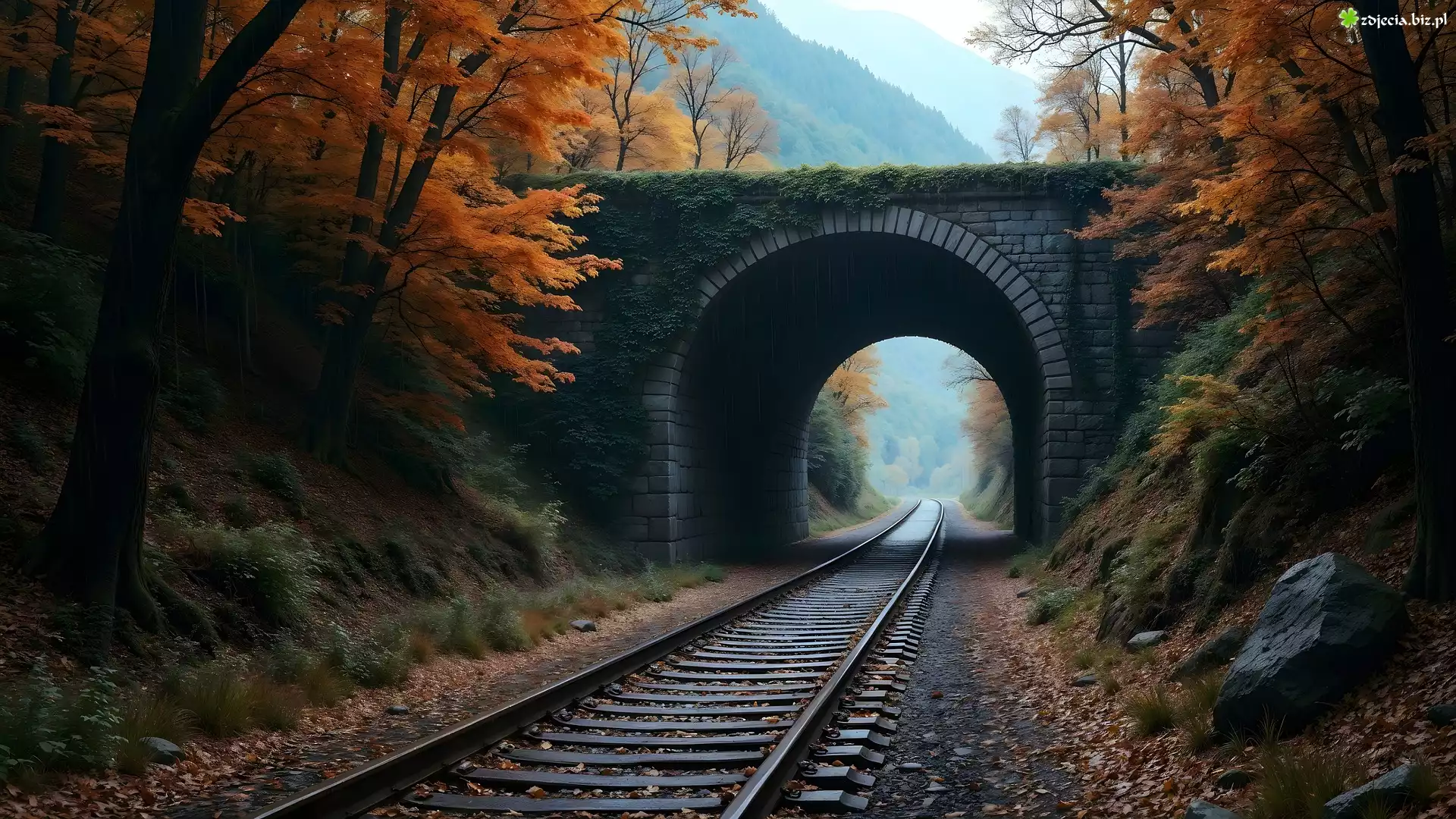 Zdjęcie Most, Kamienny, Tory, Drzewa, Jesień, AI