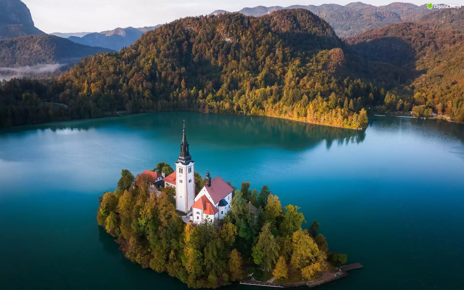 Zdjęcie Słowenia, Jezioro, Bled, Wyspa, Kościół, Lasy, Góry, Drzewa