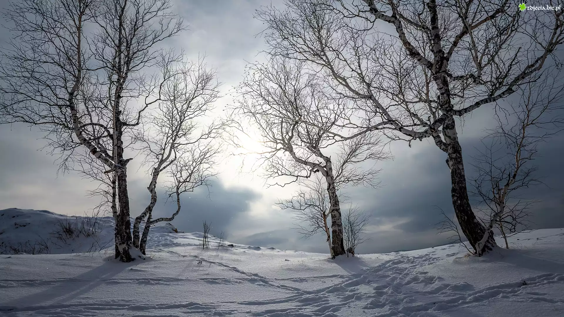 Zdjęcie Zima, Drzewa, Brzozy, Śnieg, Ślady