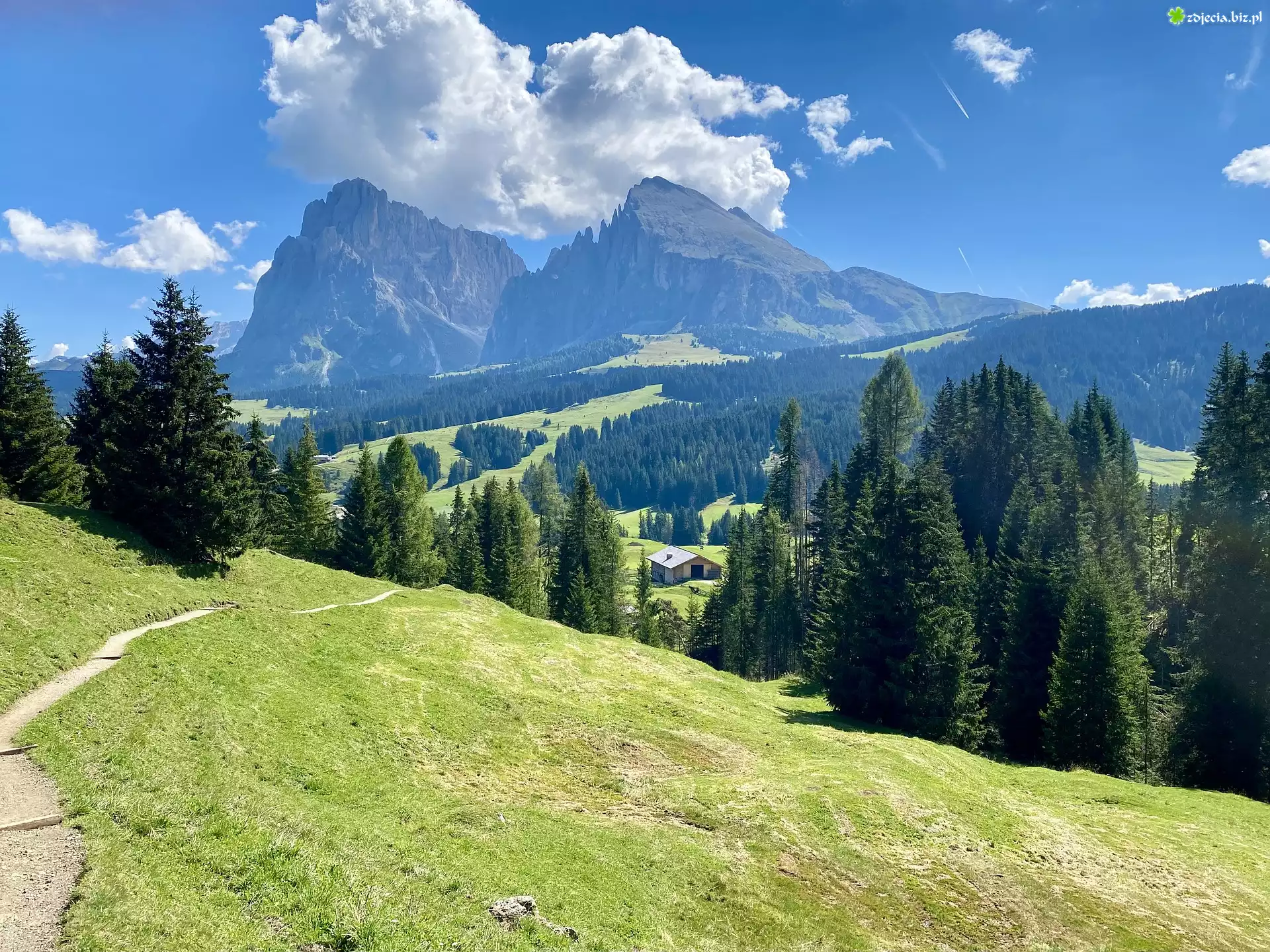 Zdjęcie Łąka, Wzgórze, Droga, Drzewa, Góry, Chmury