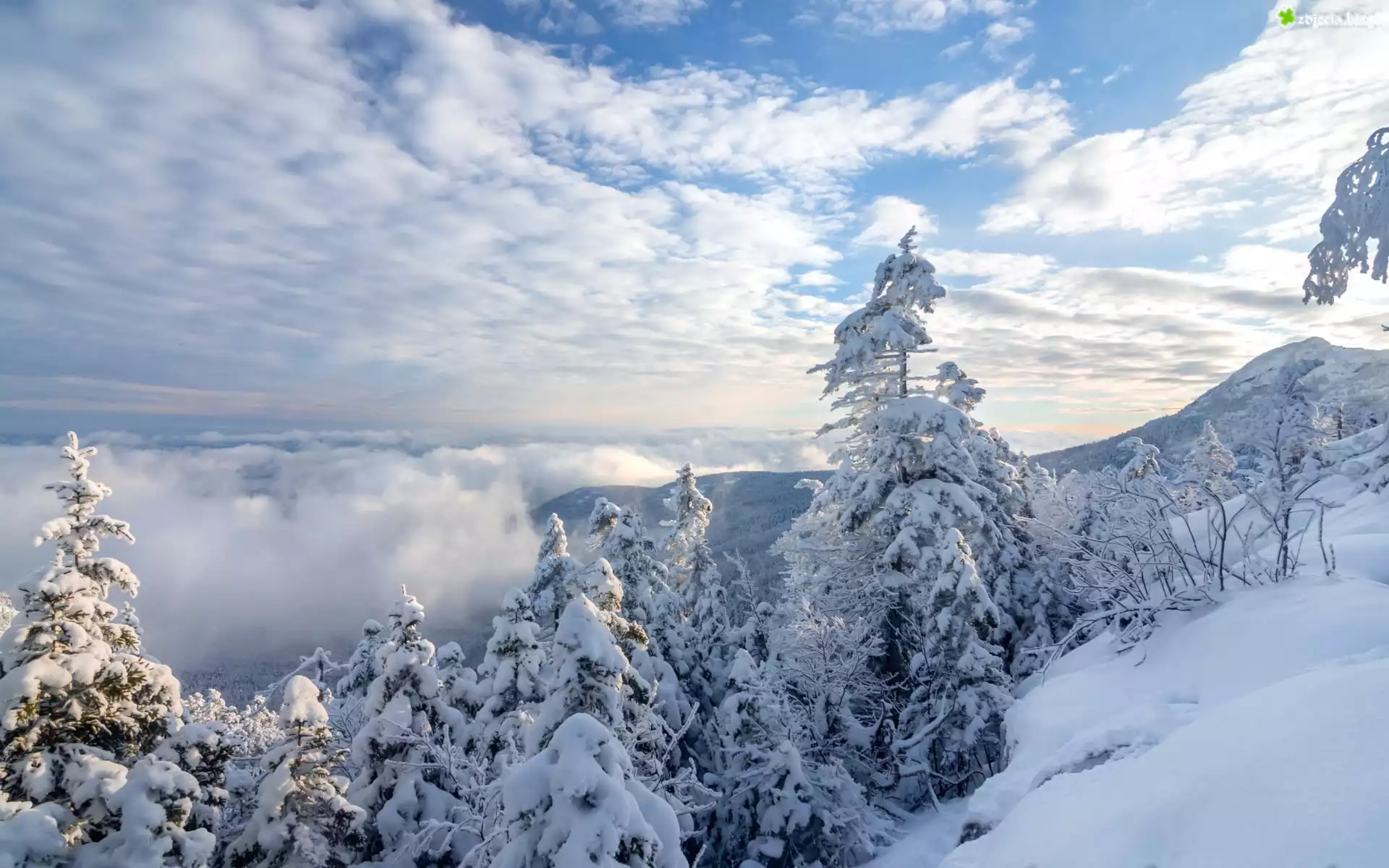 Zdjęcie Zima, Góry, Ośnieżone, Drzewa, Las, Chmury