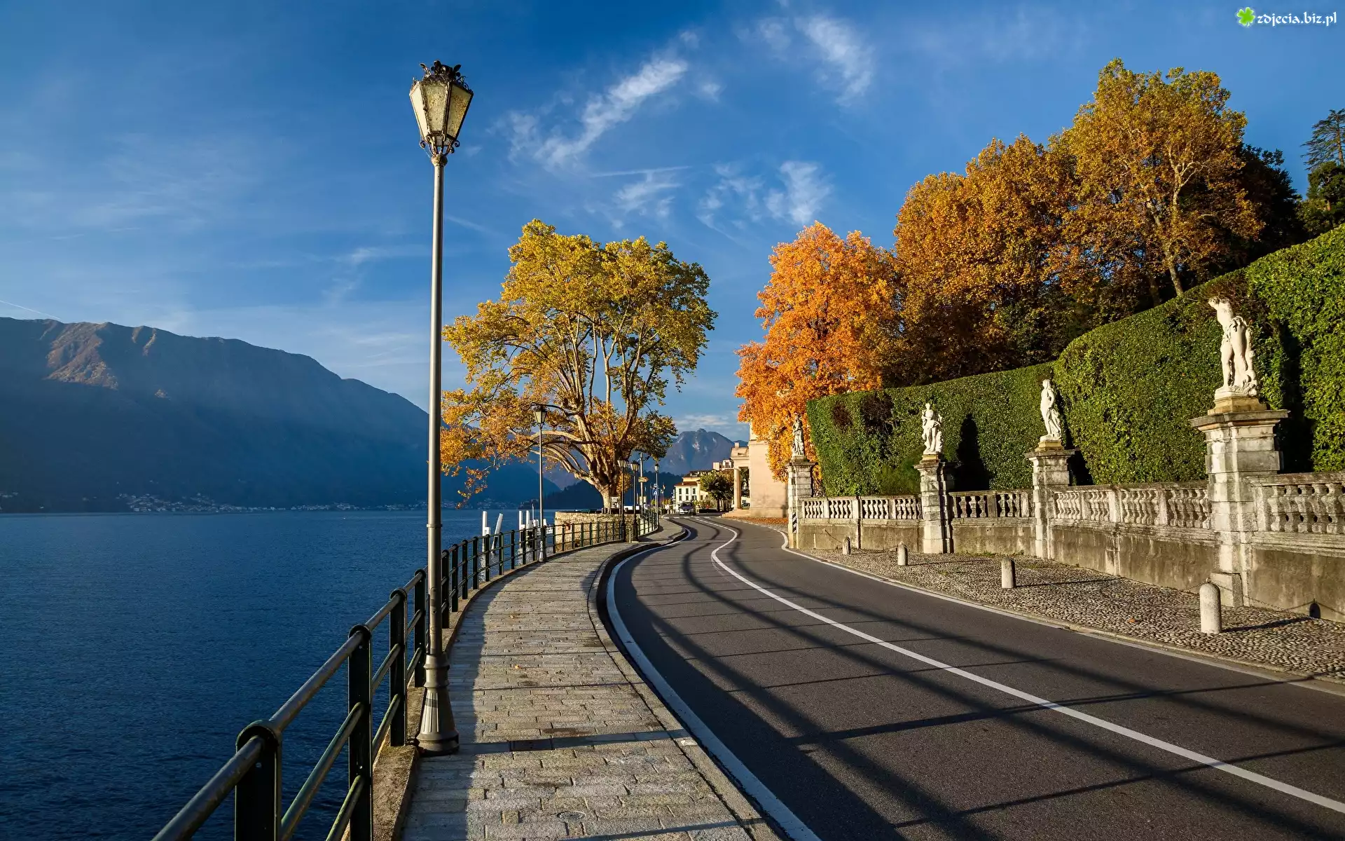 Zdjęcie Włochy, Jezioro Como, Lago di Como, Droga, Latarnia, Jesień, Drzewa