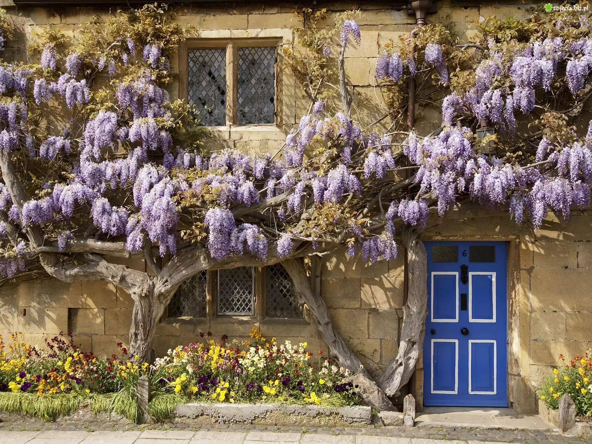Zdjęcie, Dom, Drzewa, Kwiaty