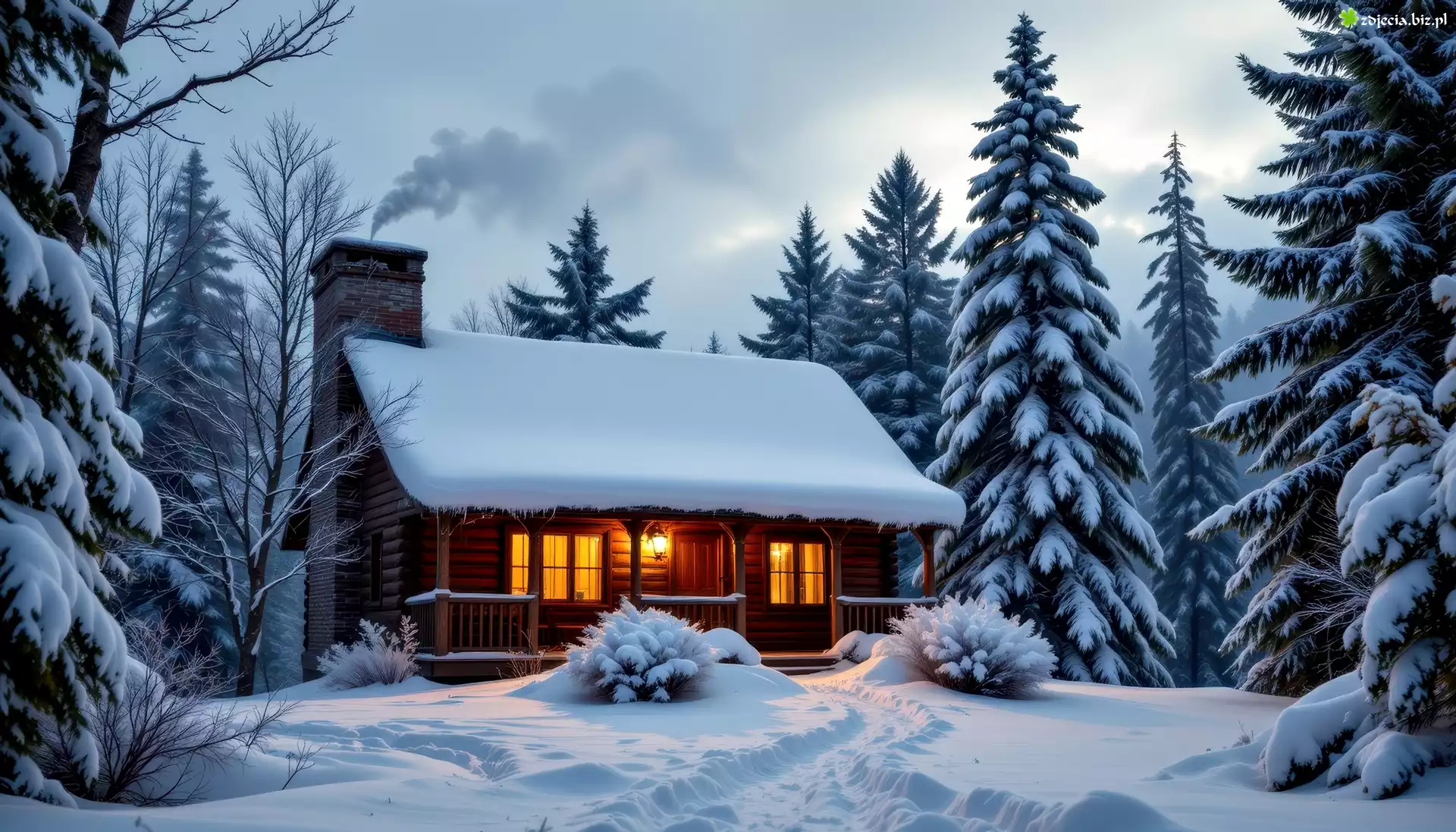 Zdjęcie Zima, Oświetlony, Dom, Drzewa, Dym, Grafika AI