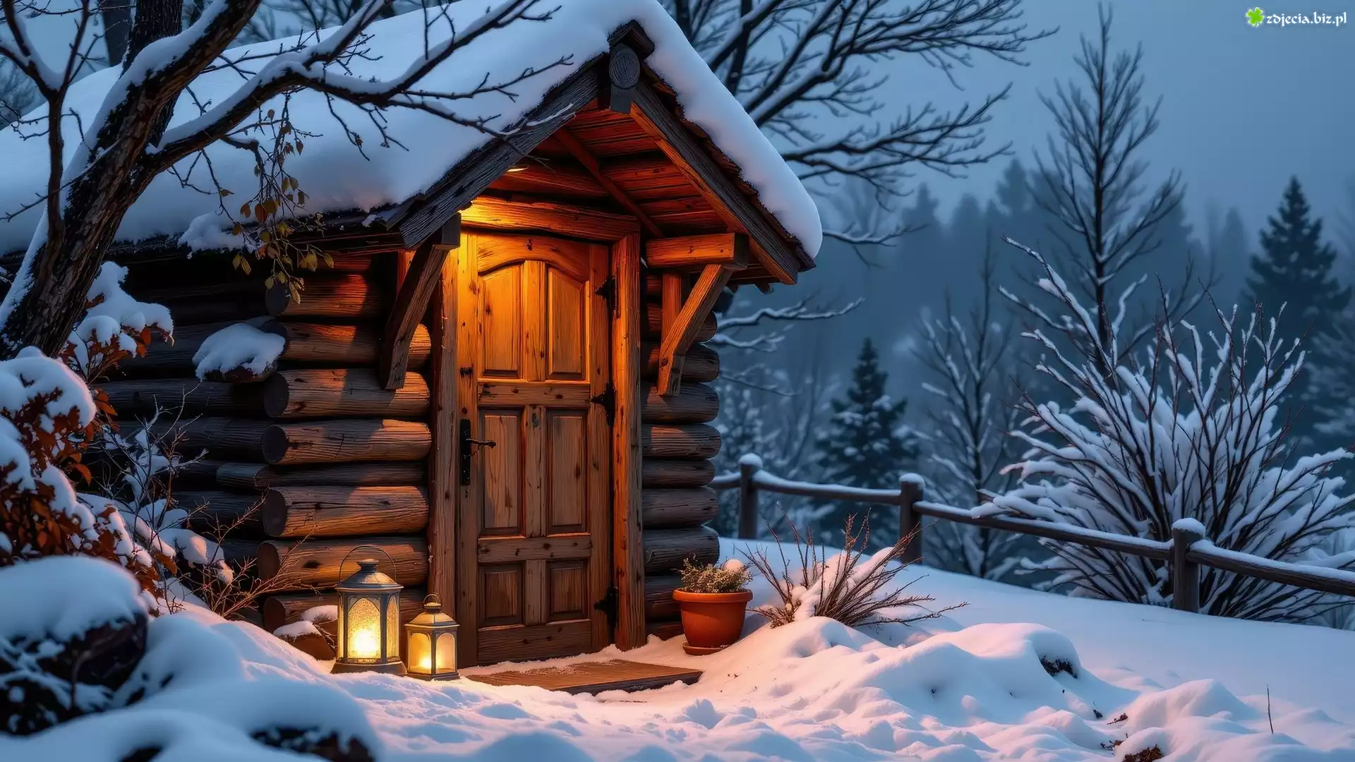 Zdjęcie Zima, Śnieg, Dom, Szopa, Rozświetlone, Lampiony, Ośnieżone, Drzewa