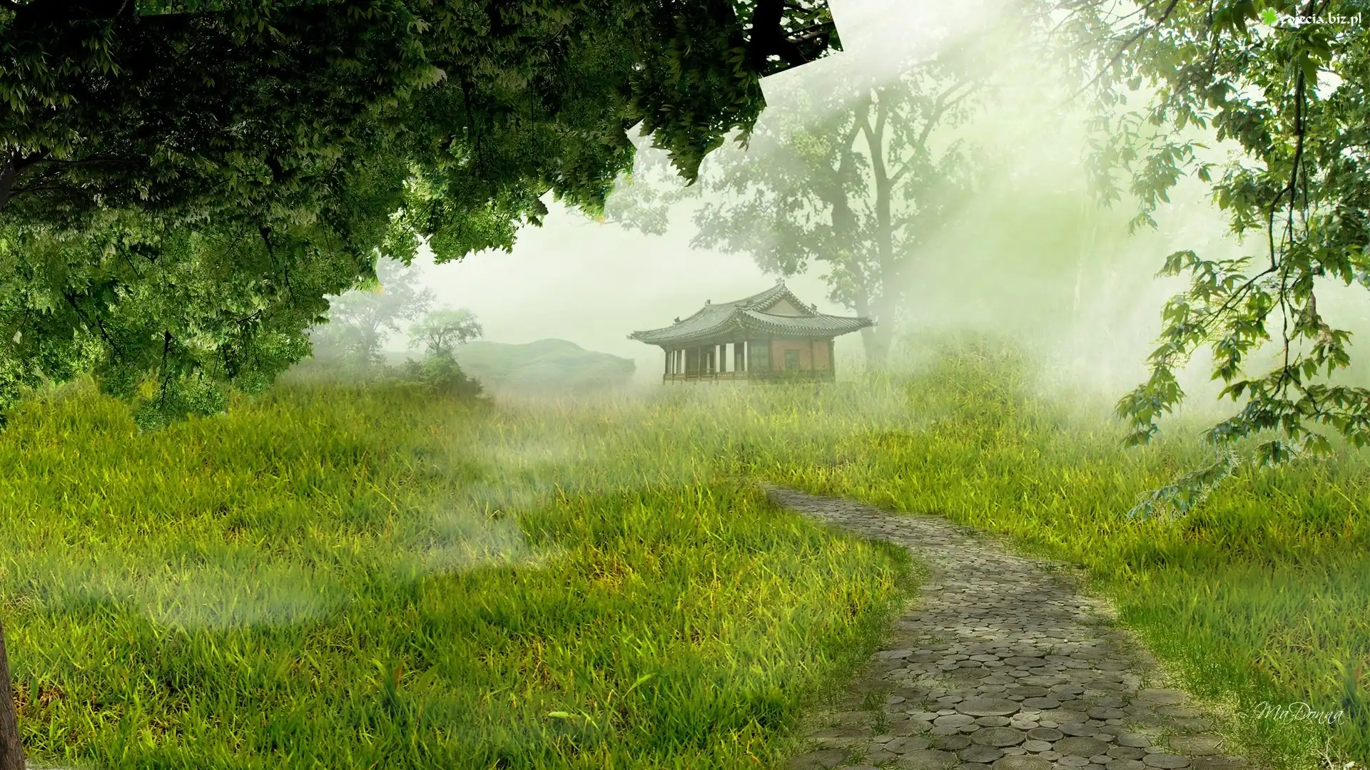 Zdjęcie Domek, Drzewa, Trawa
