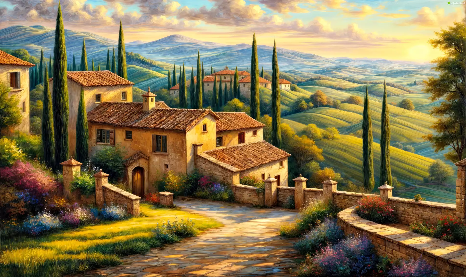 Zdjęcie Włochy, Toskania, Domy, Drzewa, Góry, Niebo, Grafika