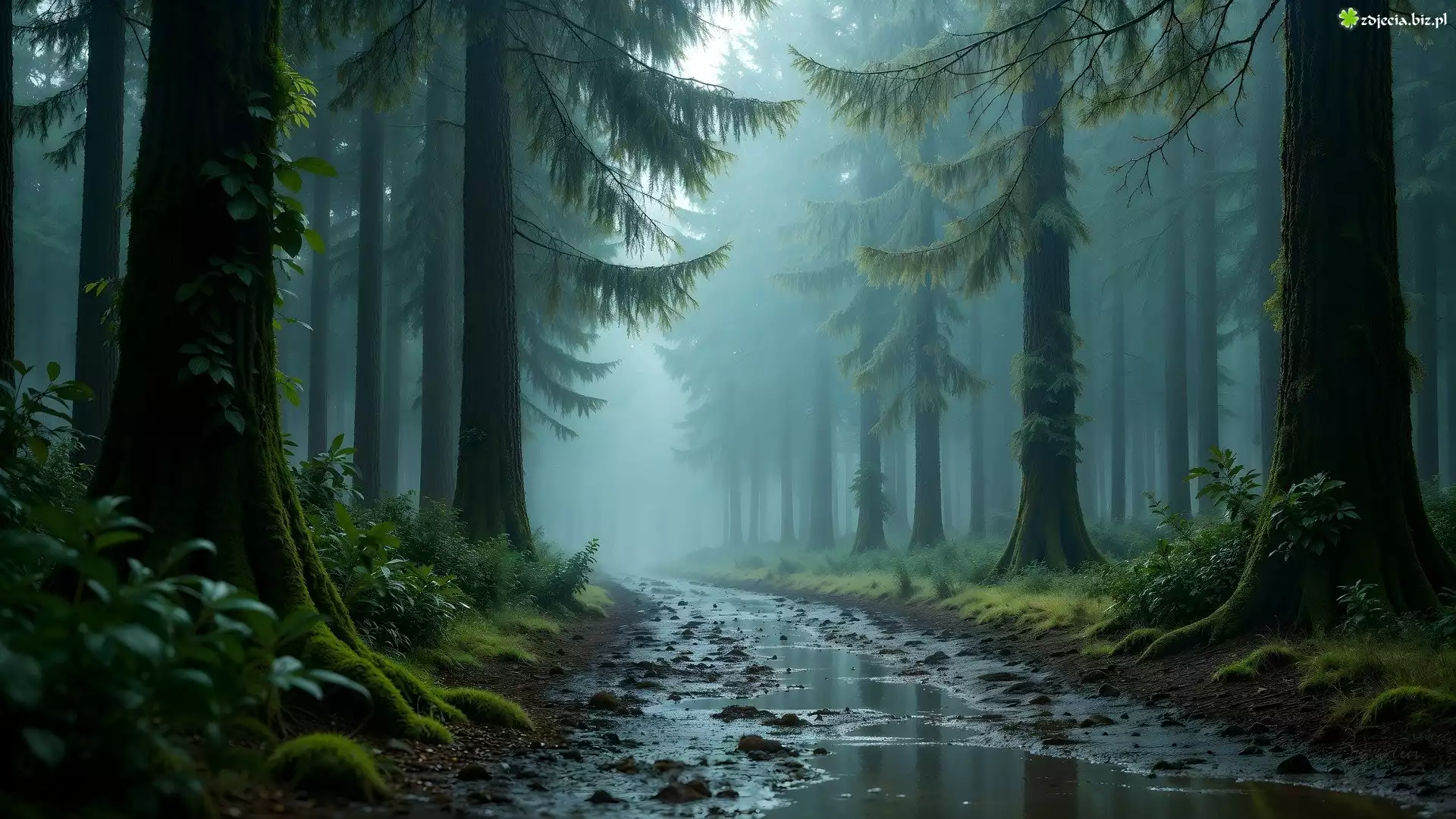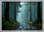 Zdjęcie Las, Drzewa, Droga, Kałuże, Mgła