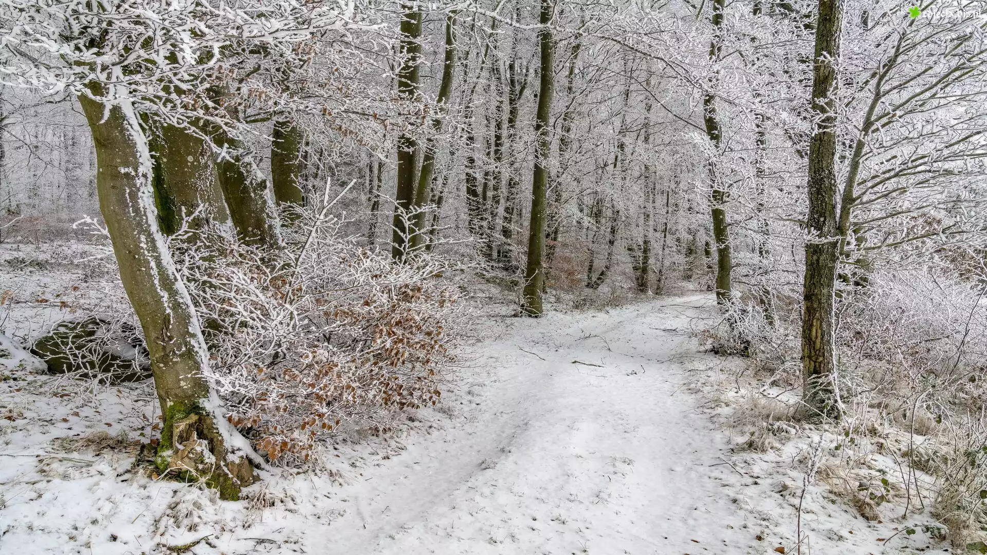 Zdjęcie, Zima, Las, Oszronione, Drzewa, Krzewy, Droga