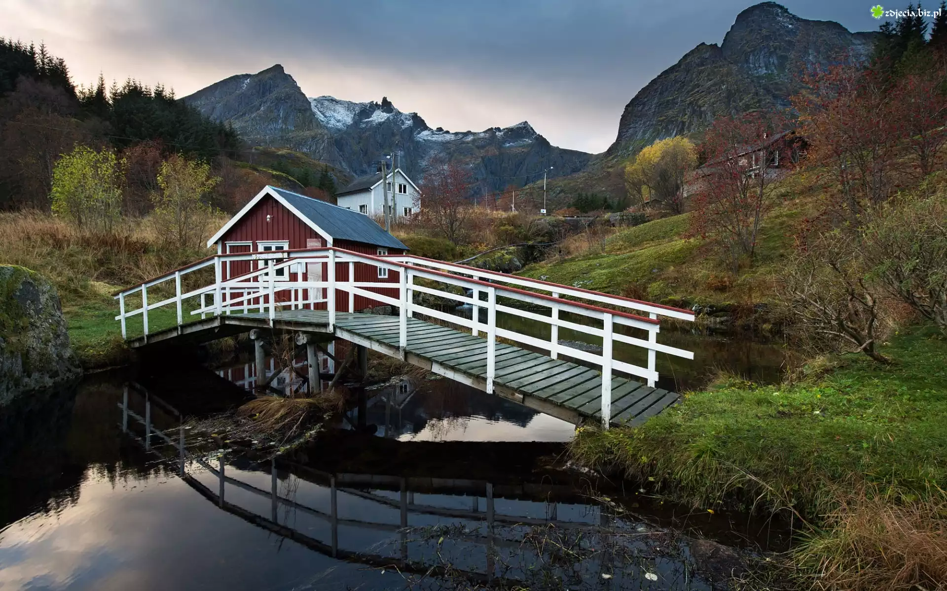 Zdjęcie Góry, Rzeka, Most, Domy, Drzewa, Skansen, Wioska Nusfjord, Gmina Flakstad, Wyspa Flakstadoya, Lofoty, Norwegia |