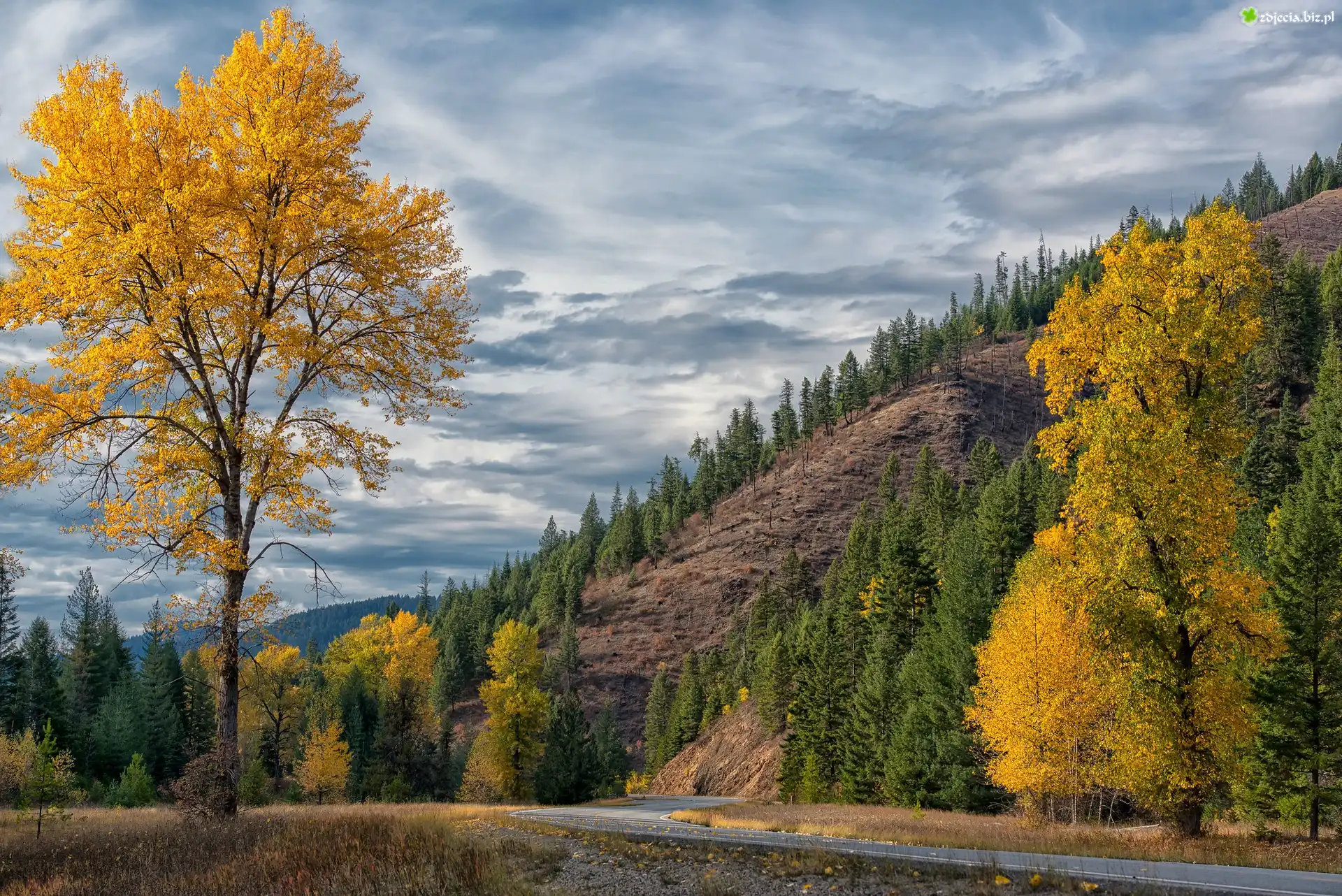 Zdjęcie Jesień, Drzewa, Góry, Pożółkłe, Liście