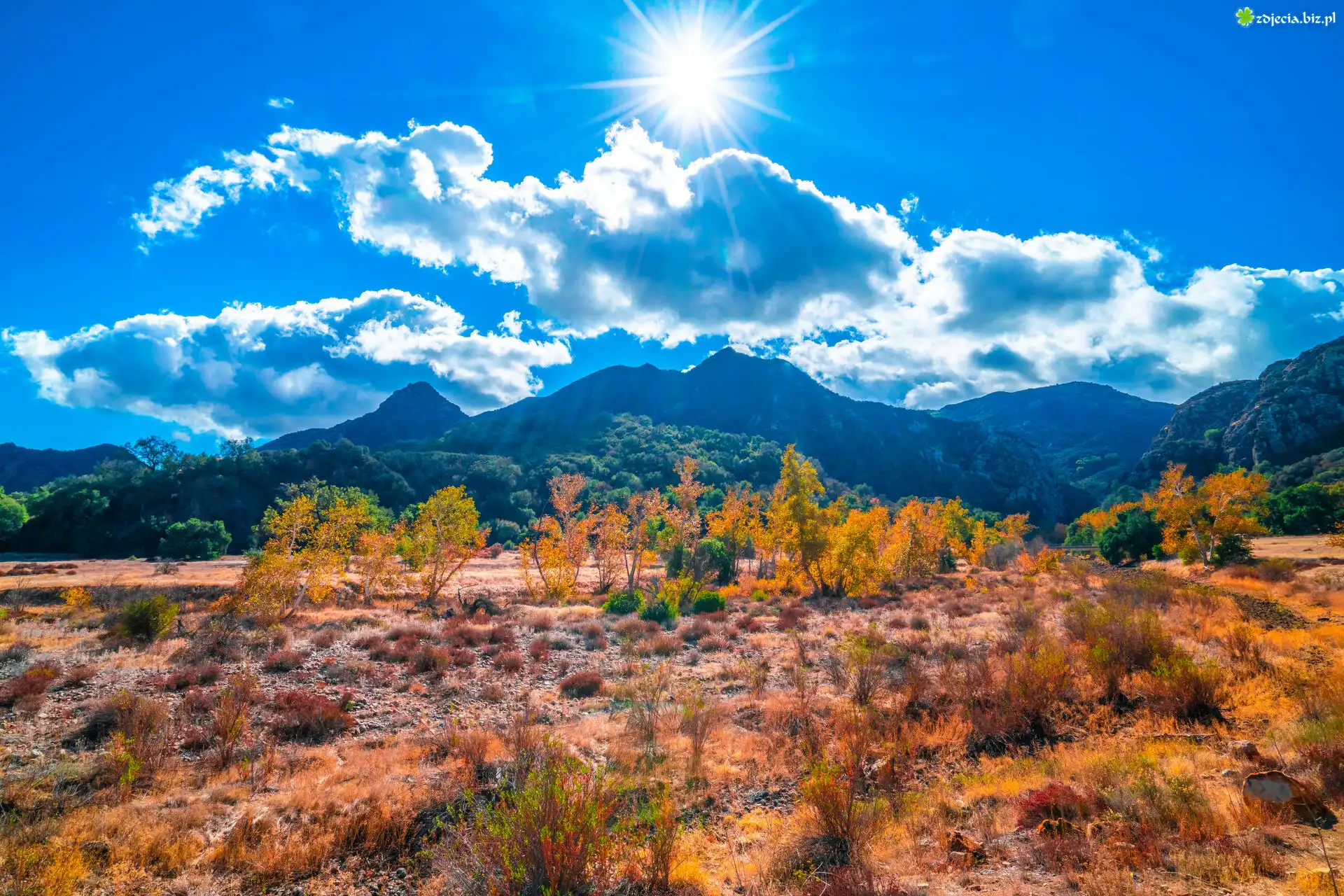 Zdjęcie Góry, Drzewa, Trawa, Jesień, Chmury, Promienie słońca