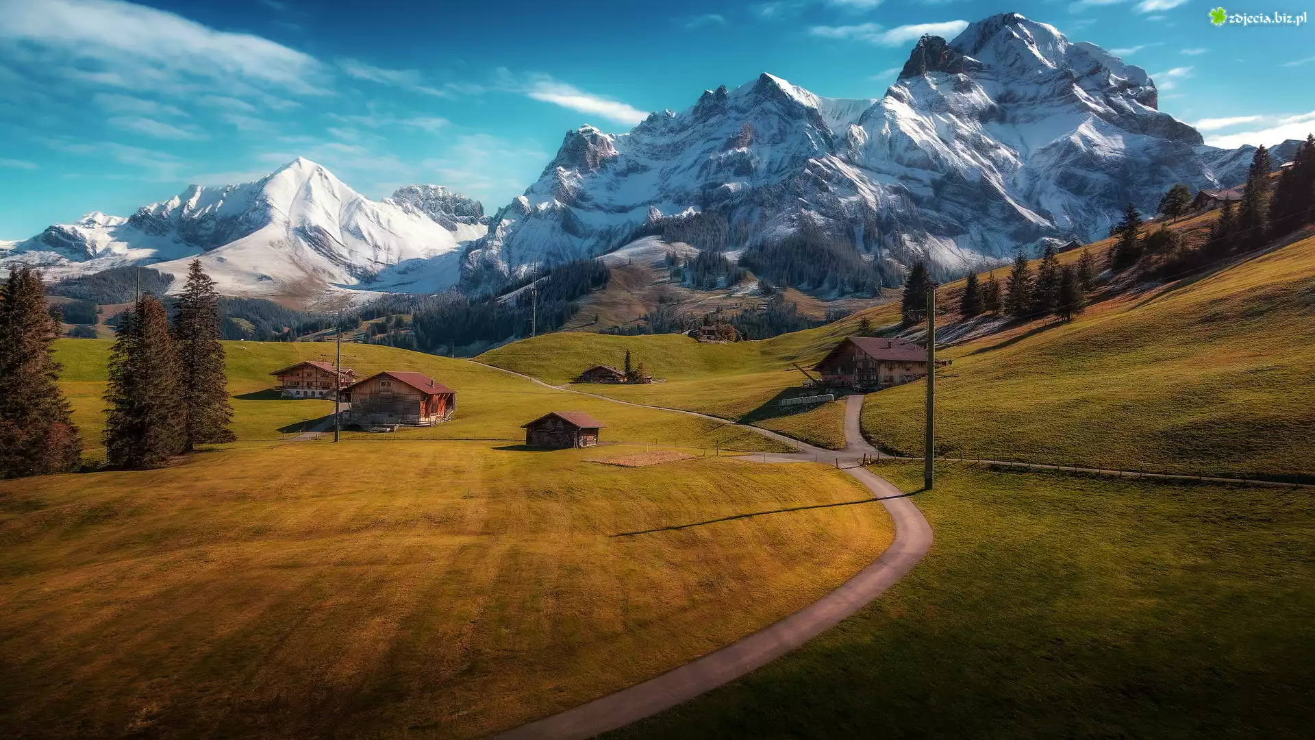 Zdjęcie Góry, Alpy Berneńskie, Pola, Łąki, Drzewa, Domy, Drogi, Adelboden, Kanton Berno, Szwajcaria