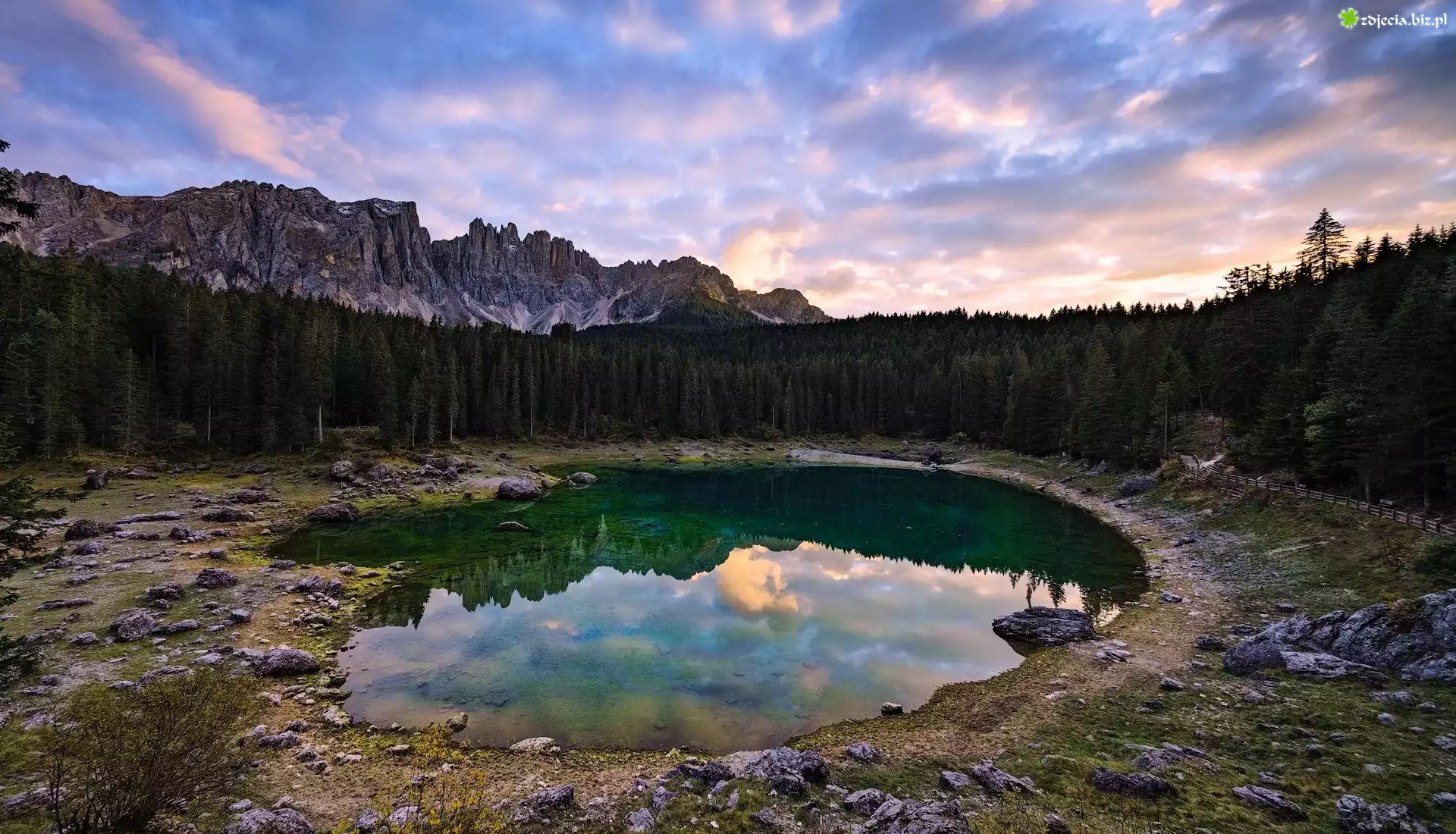 Zdjęcie Jezioro, Lago di Carezza, Góry, Dolomity, Alpy, Las, Drzewa, Chmury, Odbicie, Południowy Tyrol, Włochy |