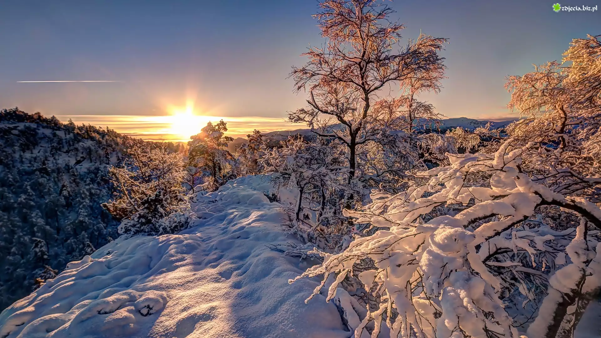 Zdjęcie Góry, Drzewa, Lasy, Wschód, Słońca, Promienie, Zima