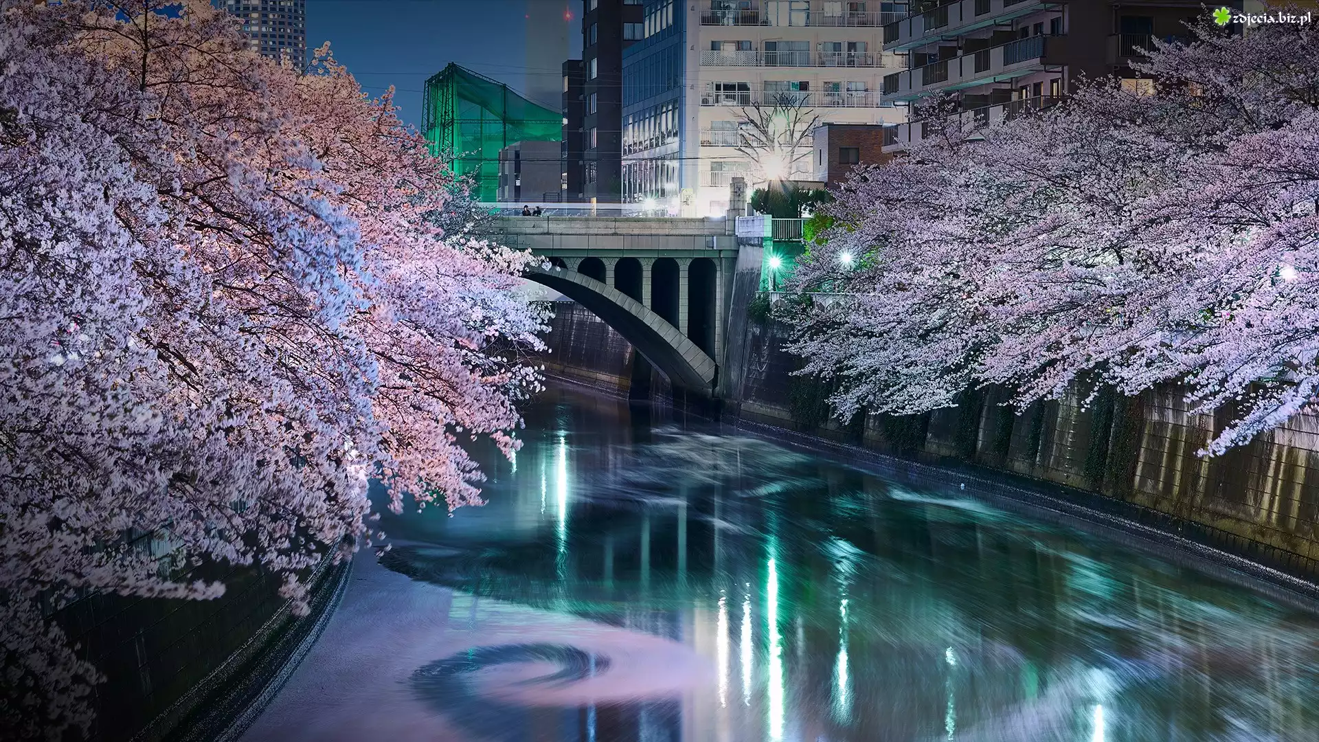 Zdjęcie Okwiecone, Drzewa, Domy, Rzeka Meguro, Most, Tokio, Japonia