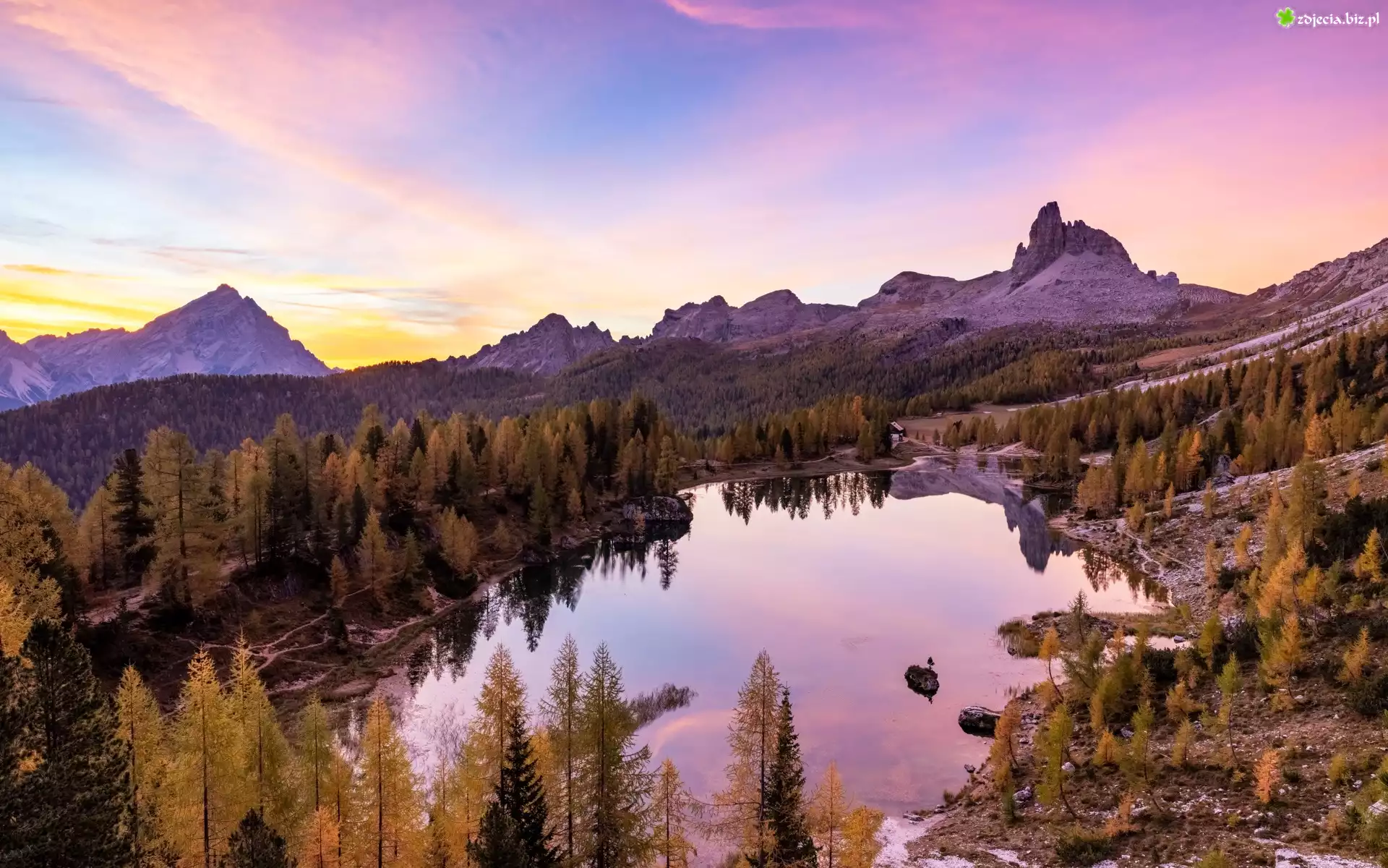 Zdjęcie, Jezioro, Federa Lake, Góry, Dolomity, Las, Drzewa, Jesień, Prowincja Belluno, Włochy