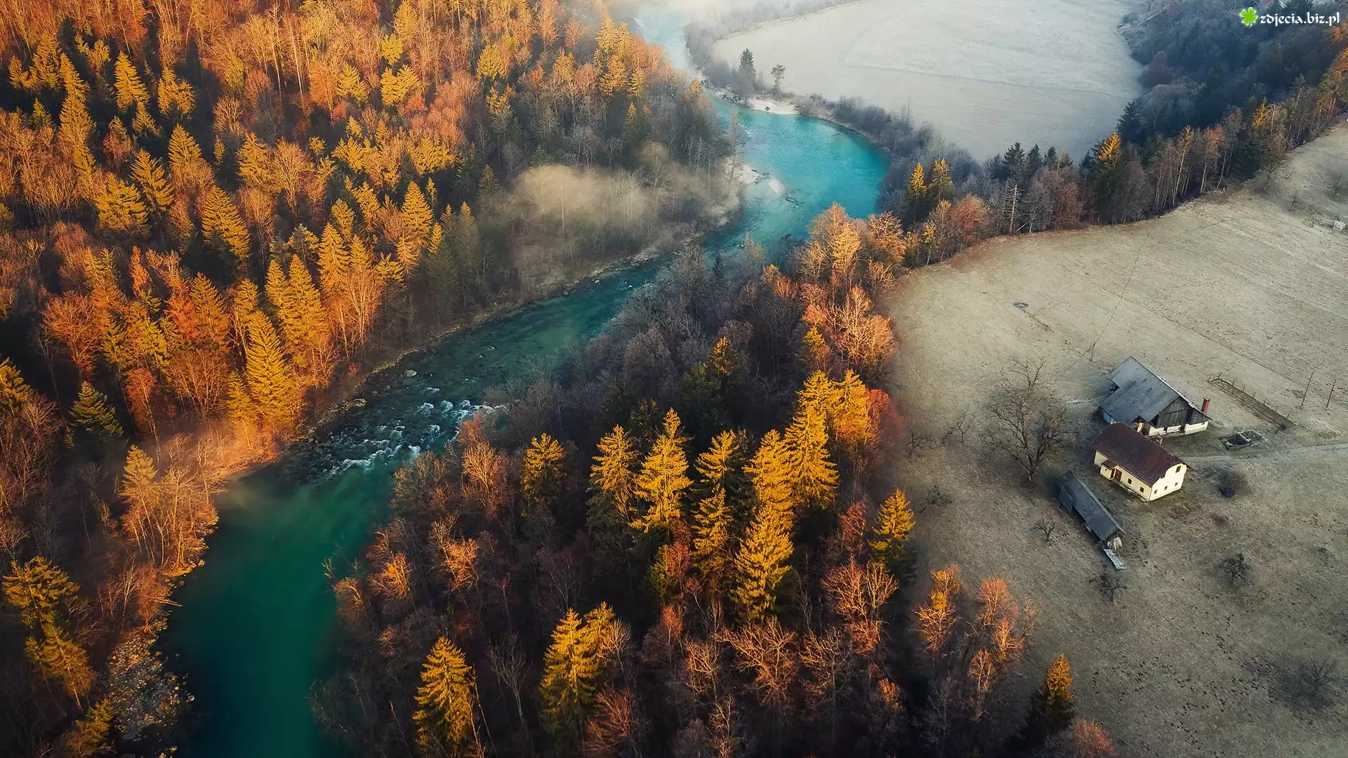 Zdjęcie Jesień, Rzeka Sava, Mgła, Pożółkłe, Drzewa, Polana, Domy, Z lotu ptaka, Słowenia