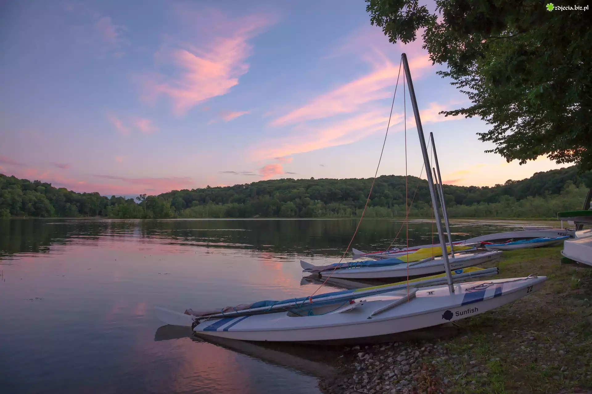 Zdjęcie, Żaglówka, Jezioro, Drzewa, Brzeg