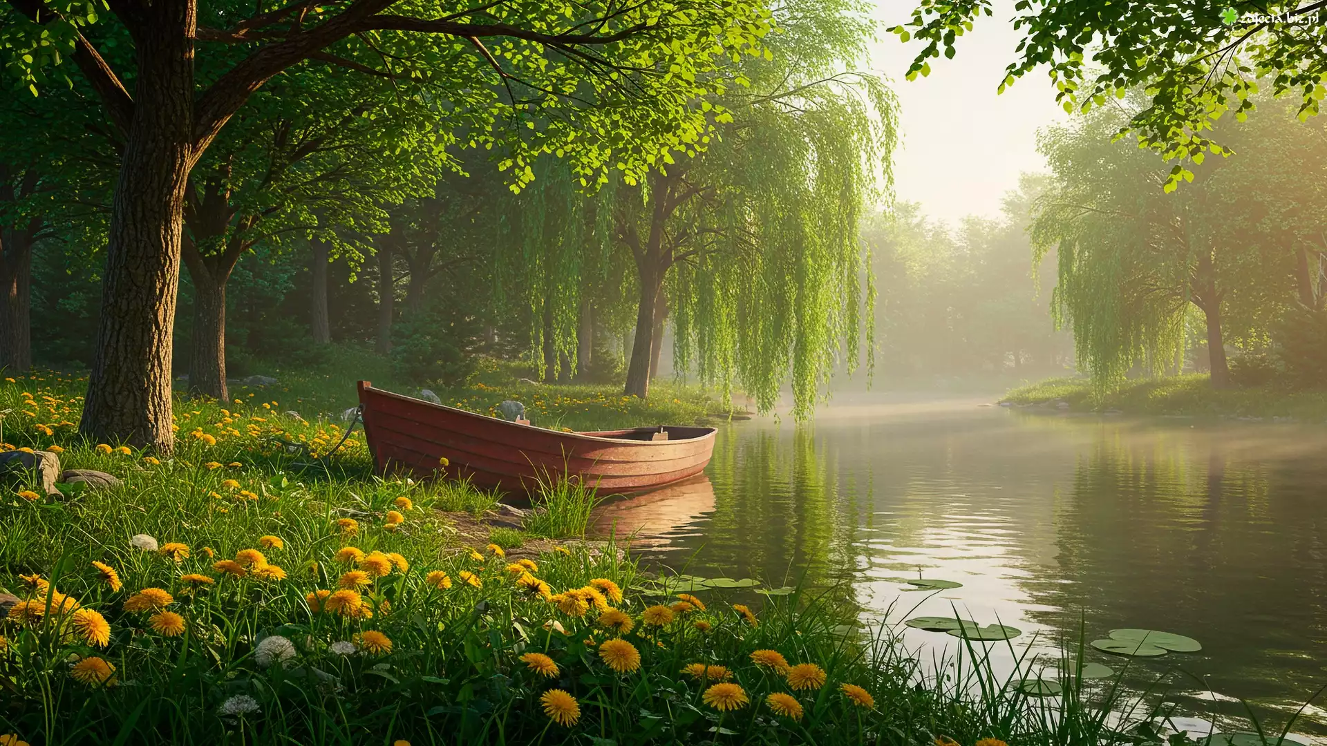 Zdjęcie Jezioro, Łódka, Kwiaty, Drzewa
