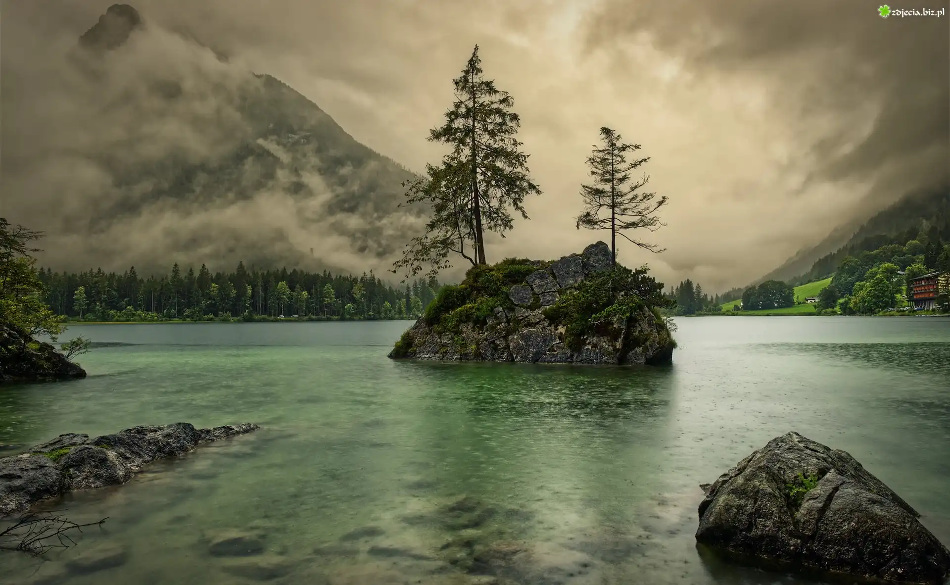 Zdjęcie Jezioro Hintersee, Góry Alpy, Mgła, Drzewa, Skały, Kamienie, Gmina Berchtesgadener, Bawaria, Niemcy |