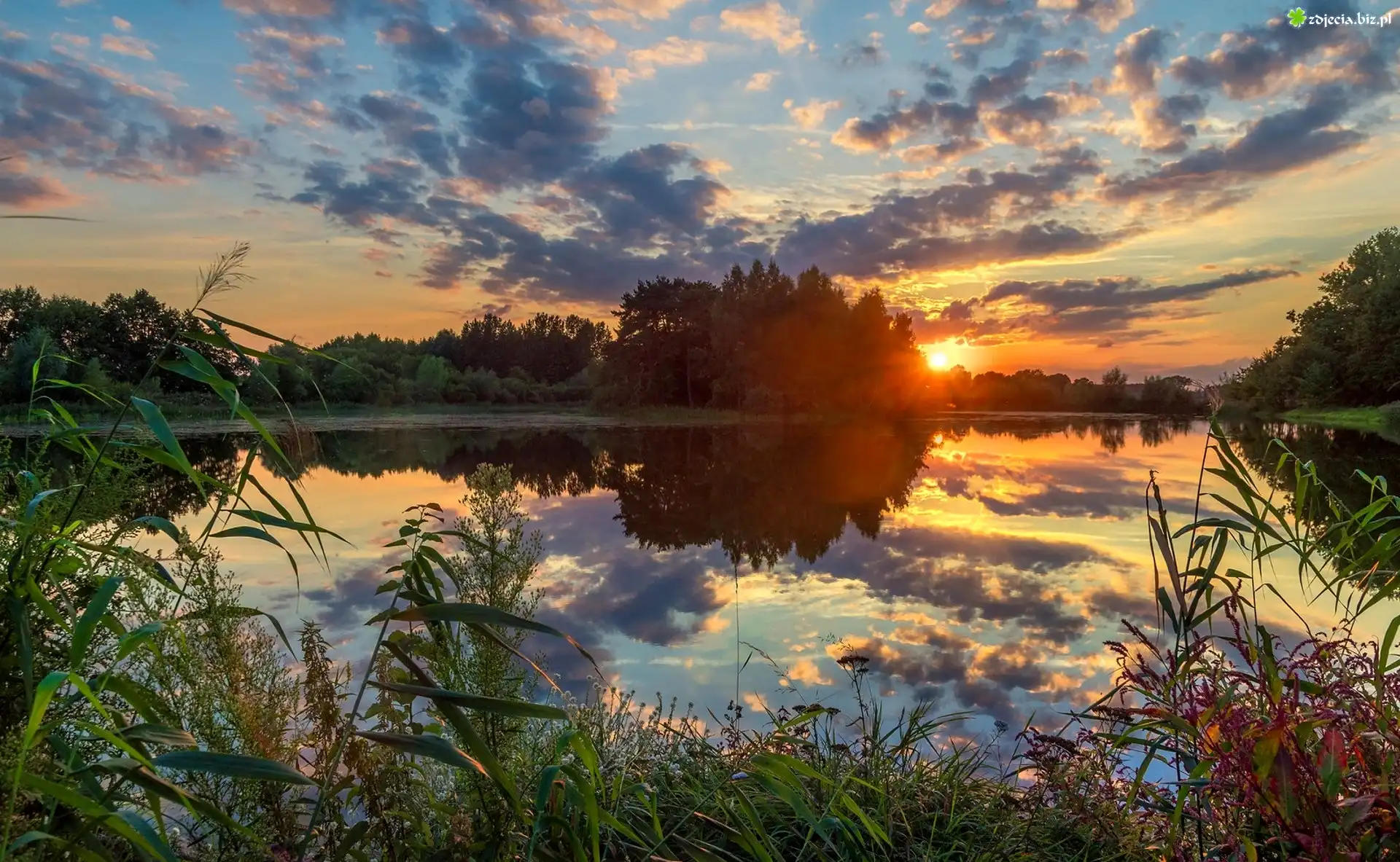 Zdjęcie Jezioro, Drzewa, Chmury, Rośliny, Zachód słońca, Odbicie