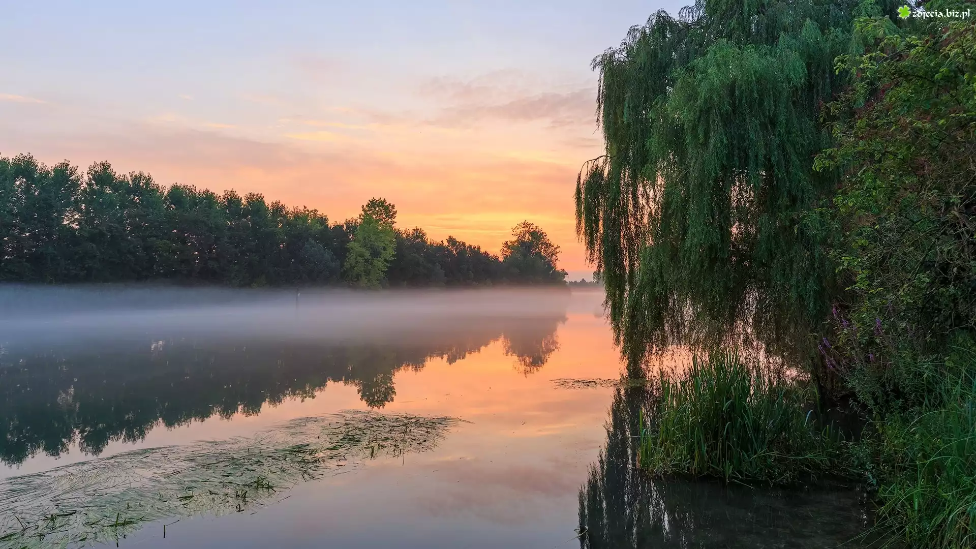Zdjęcie Jezioro, Drzewa, Wierzba płacząca, Mgła, Zachód słońca