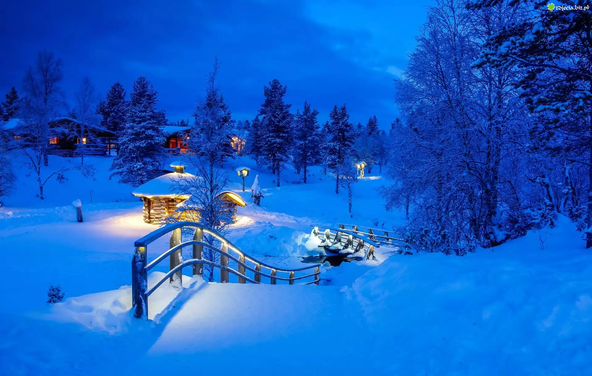 Zdjęcie Finlandia, Laponia, Kakslauttanen, Zima, Noc, Oświetlone, Domki, Mostek, Drzewa