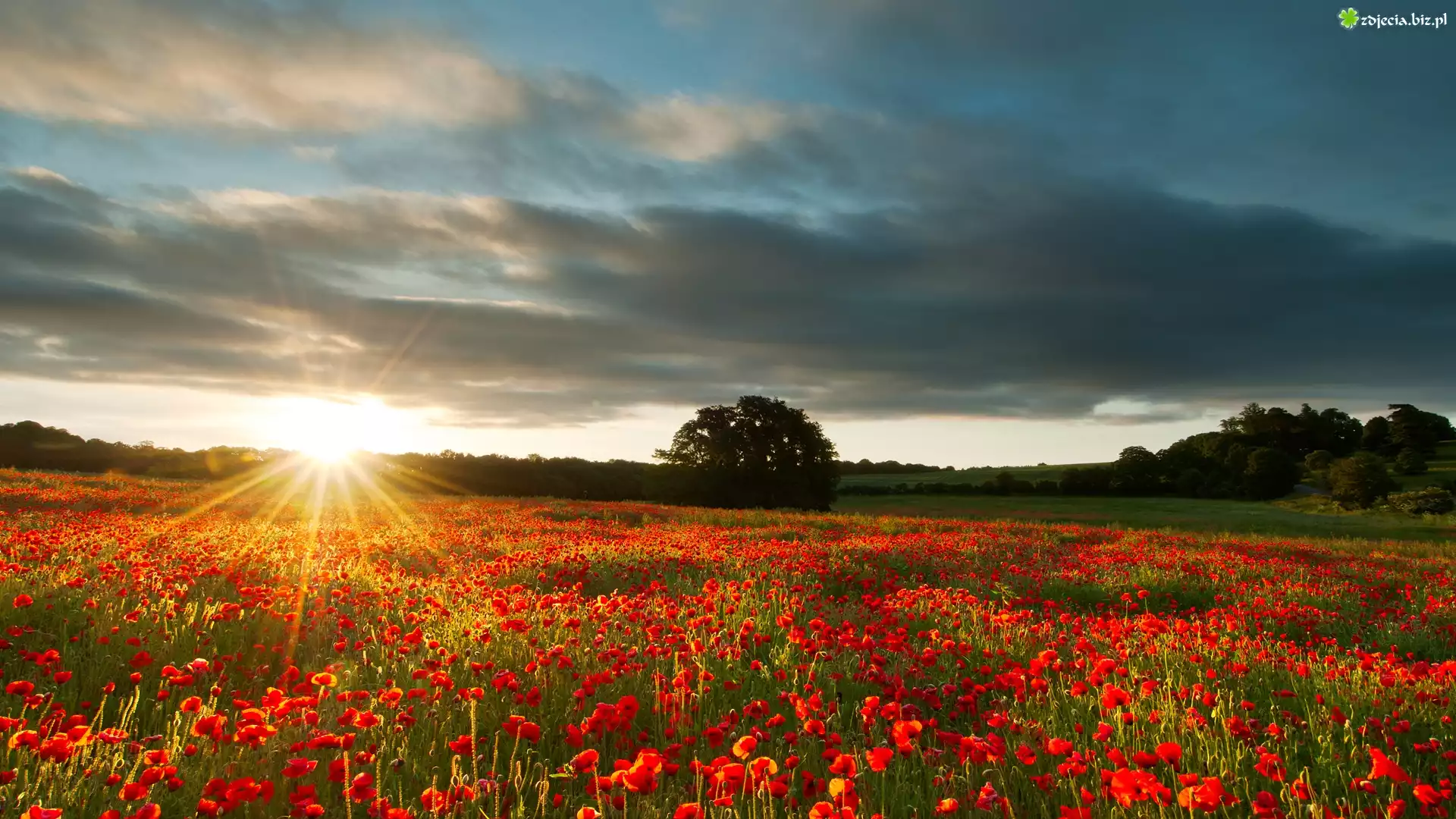 Zdjęcie Anglia, Hrabstwo Kent, Łąka, Maki, Wschód słońca, Chmury, Drzewa