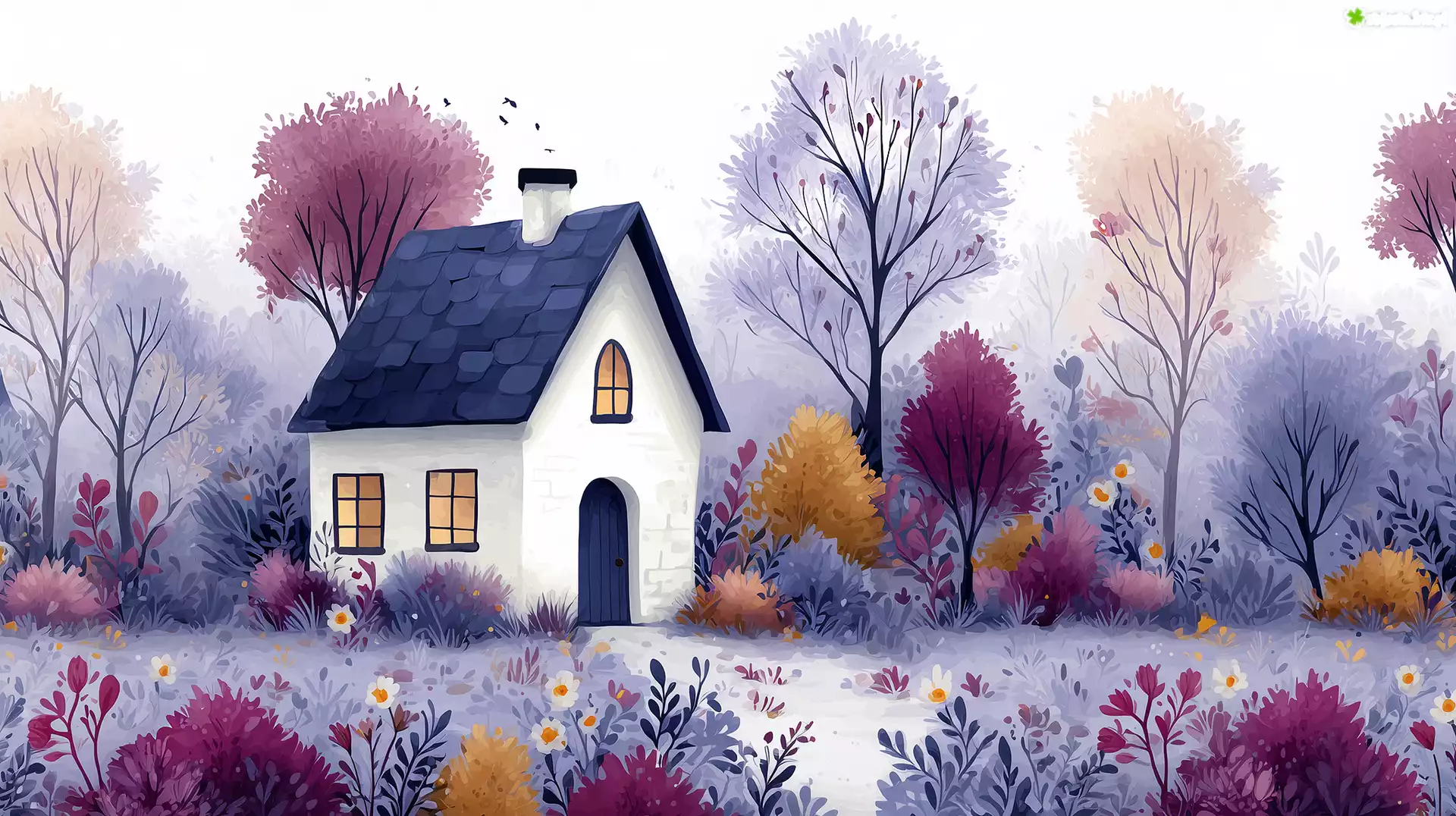 Zdjęcie, Biały, Dom, Kolorowe, Drzewa, Kwiaty, Grafika AI