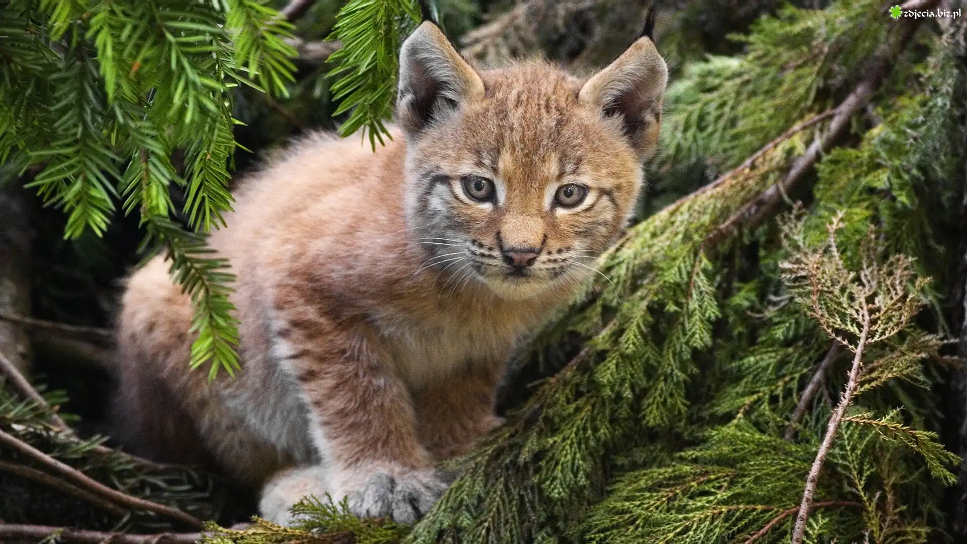 Zdjęcie Młody, Ryś, Drzewa, Iglaki