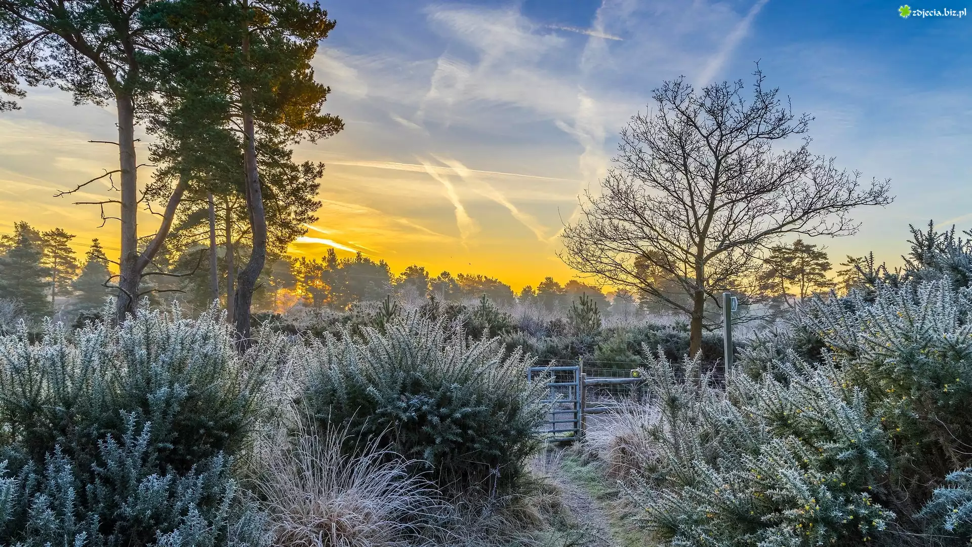 Zdjęcie Drzewa, Szron, Krzewy, Świt