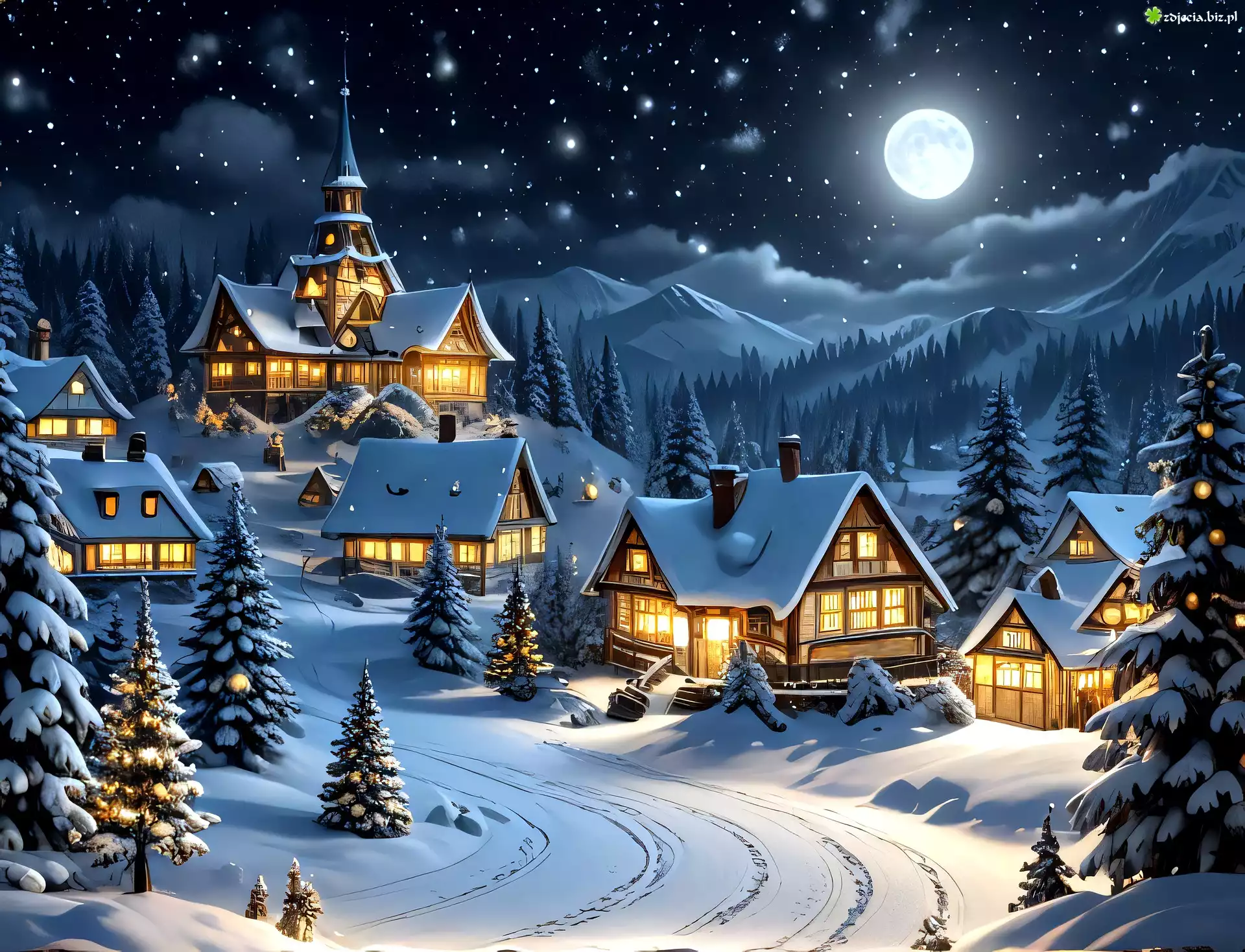 Zdjęcie Zima, Rozświetlone, Domy, Drzewa, Noc, Księżyc