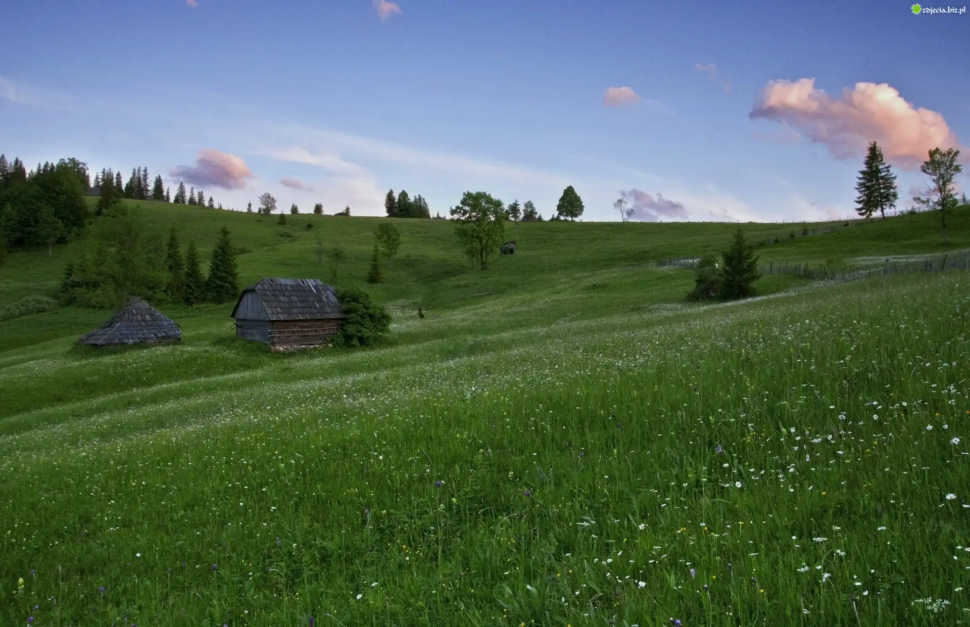 Zdjęcie Łąka, Kwiatki, Szopy, Drzewa, Wiosna