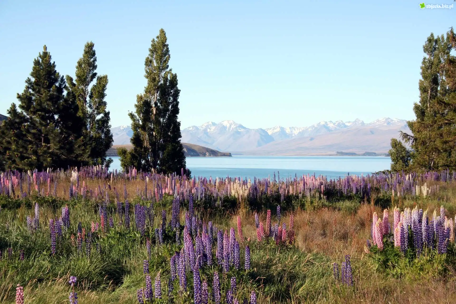 Zdjęcie, Łąka, Kwiaty, Drzewa, Góry