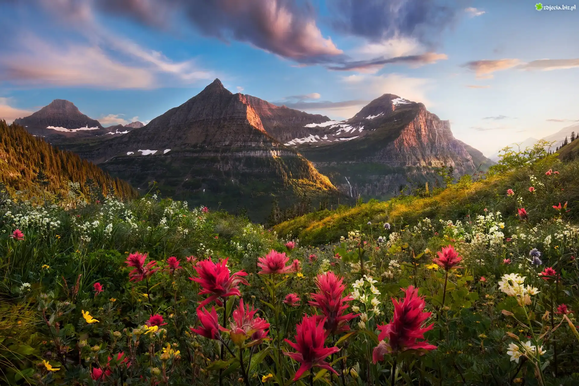 Zdjęcie Stany Zjednoczone, Montana, Park Narodowy Glacier, Mount Oberlin, Góry, Polana, Kwiaty, Drzewa, Wzgórze, Chmury, Niebo |