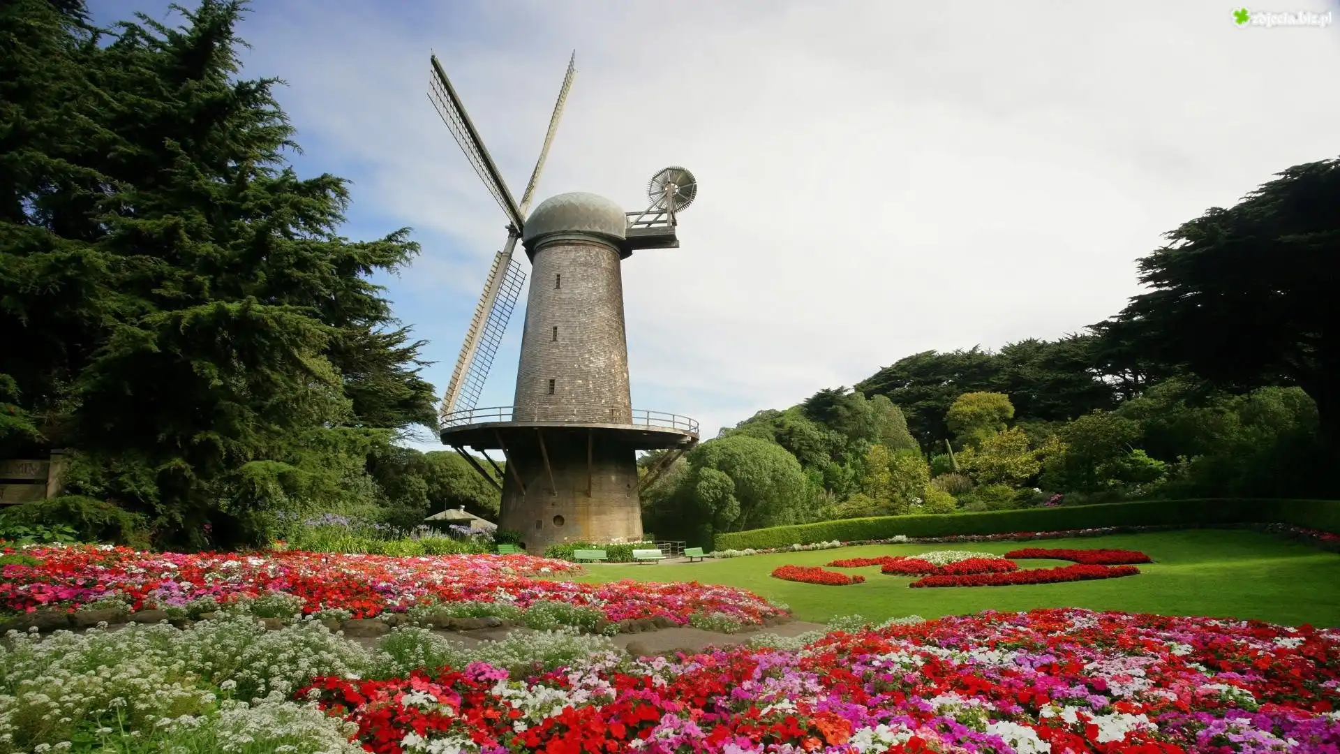 Zdjęcie Kwiaty, Drzewa, Wiatrak