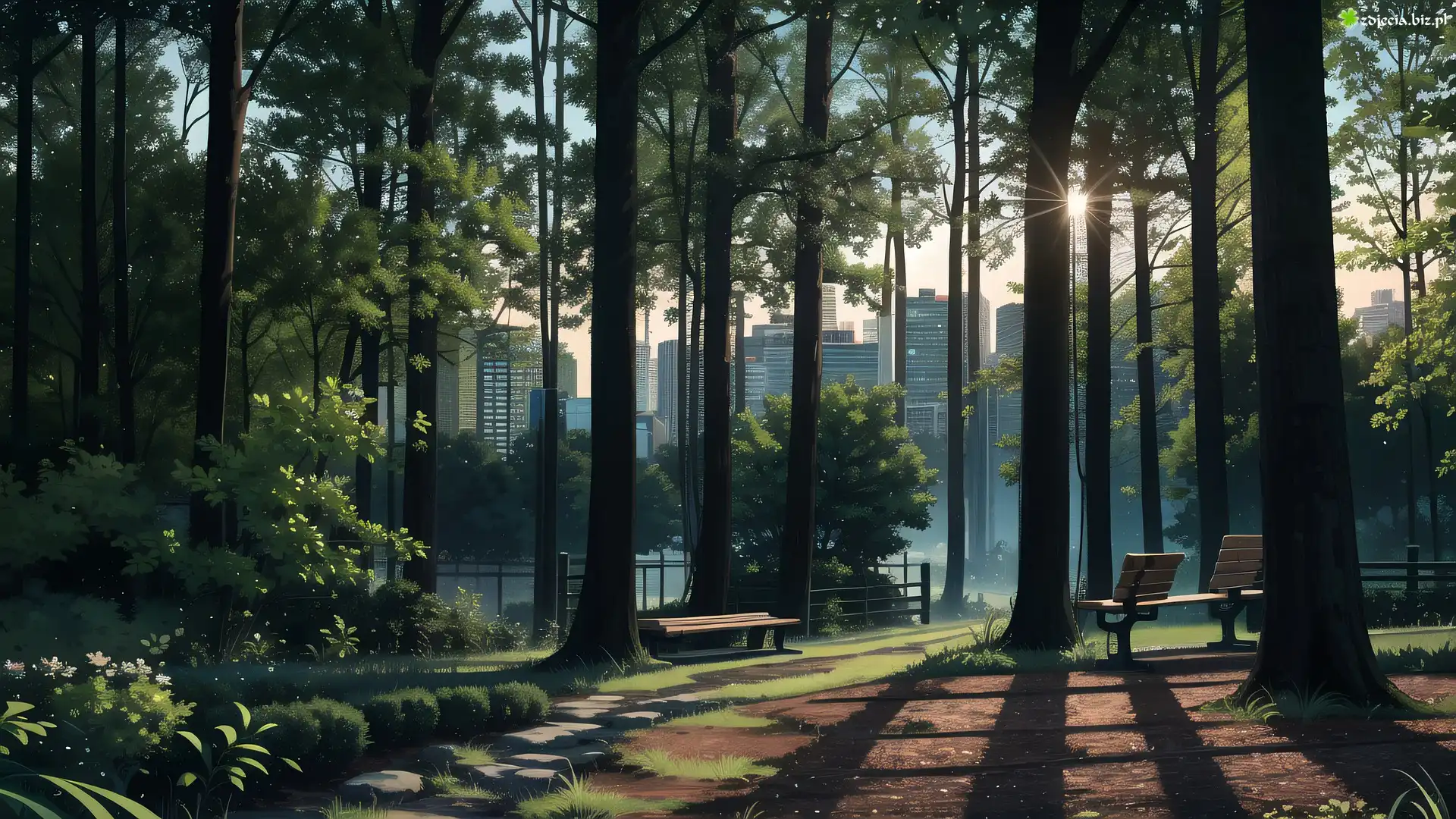 Zdjęcie Park, Drzewa, Ławki, Miasto, Grafika