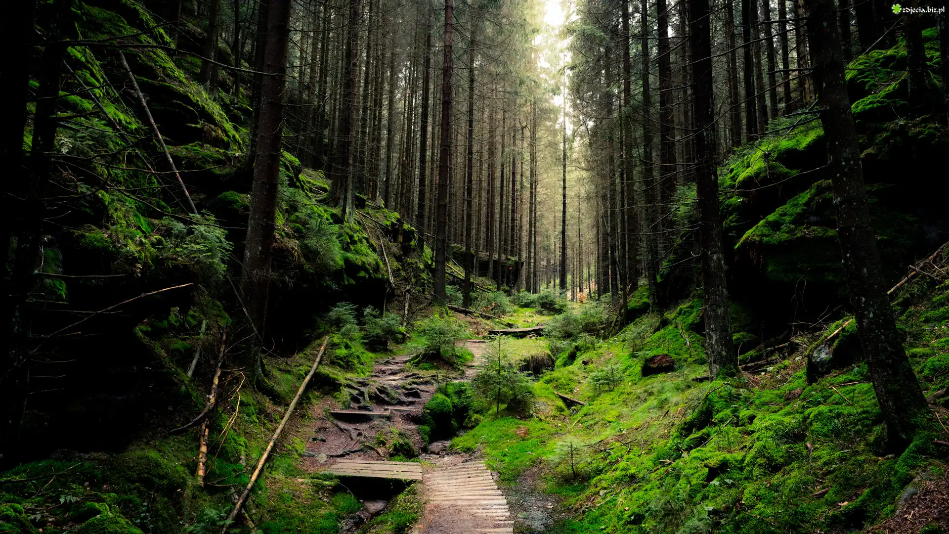 Zdjęcie Las, Drzewa, Leśna, Ścieżka, Kładka
