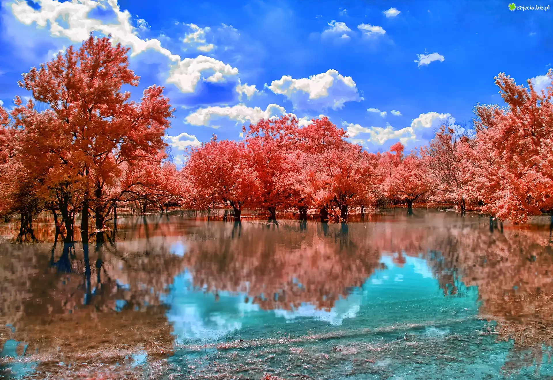 Zdjęcie Drzewa, Czerwone, Liście, Jezioro