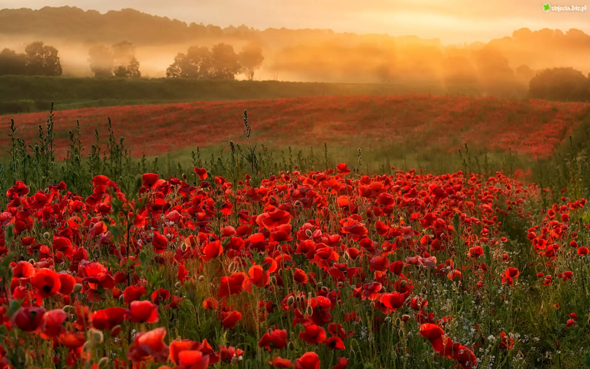 Zdjęcie Łąka, Maki, Drzewa, Mgła