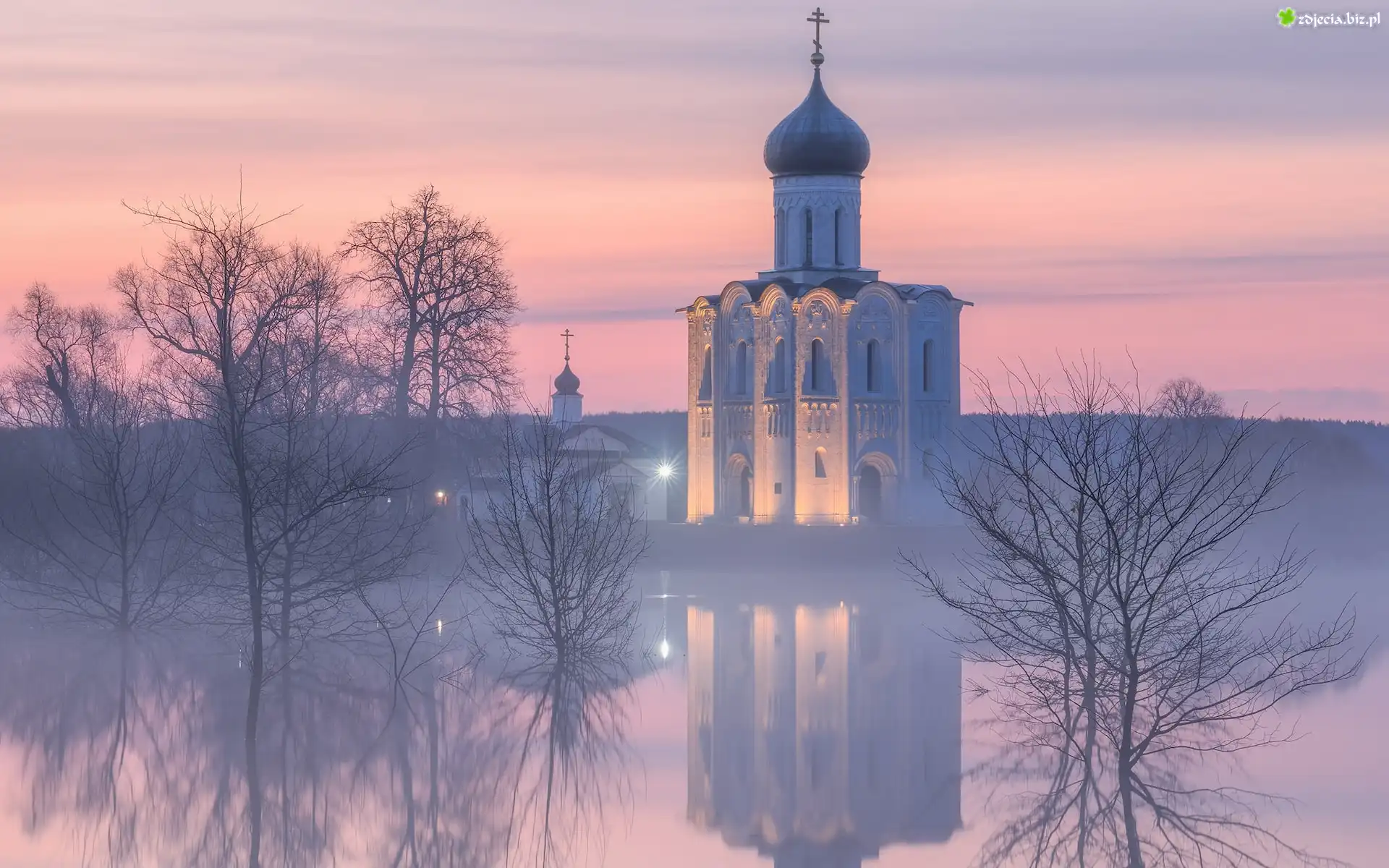 Zdjęcie Drzewa, Cerkiew Opieki Matki Bożej, Rzeka Nerl, Mgła, Odbicie, Bogolubowo, Obwód włodzimierski, Rosja |