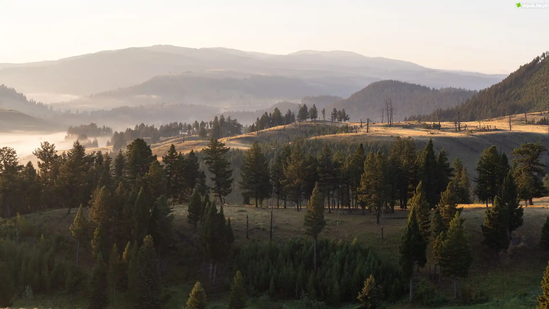 Zdjęcie Wzgórza, Drzewa, Mgła, Poranek, Góry