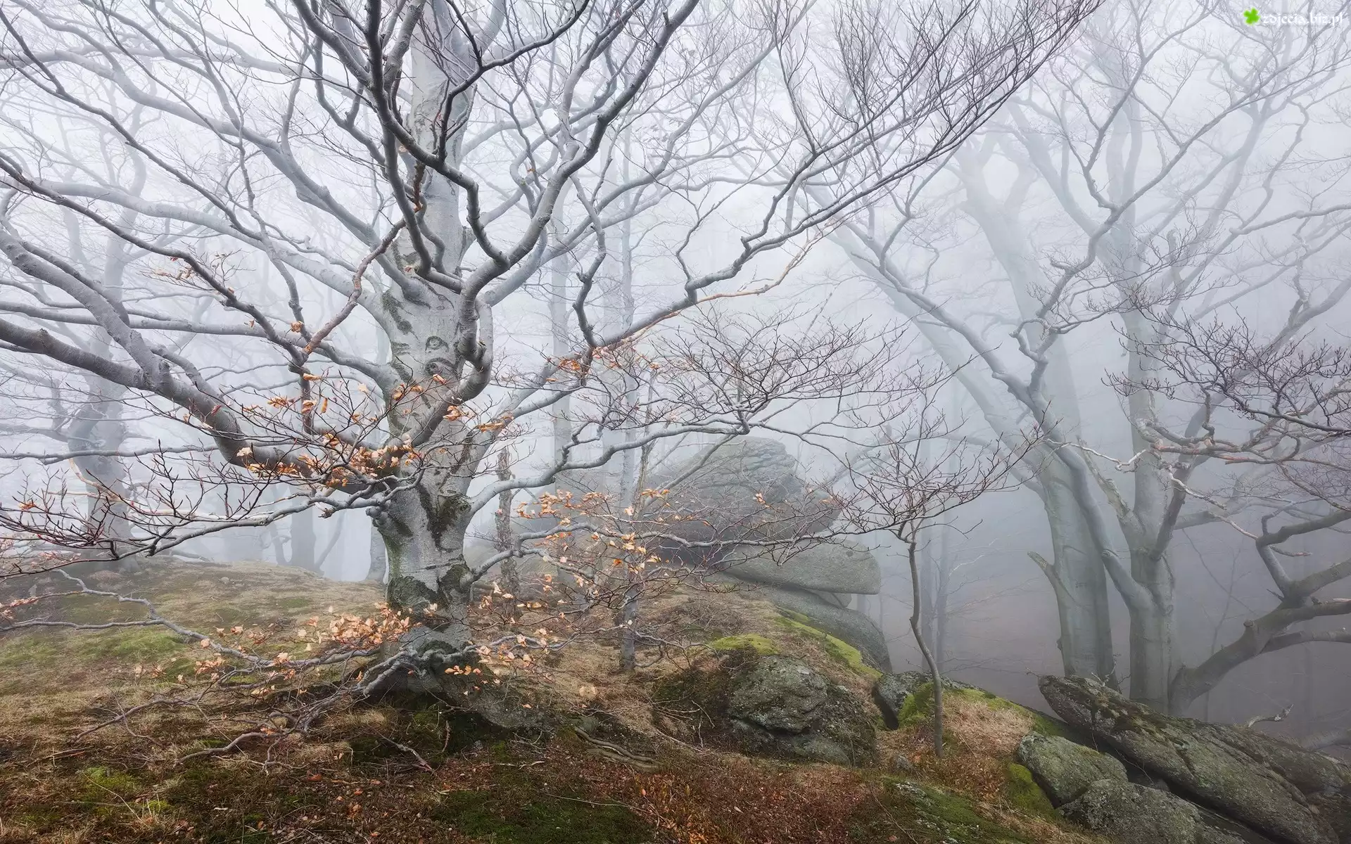 Zdjęcie Skały, Drzewa, Mgła, Zamglony, Las