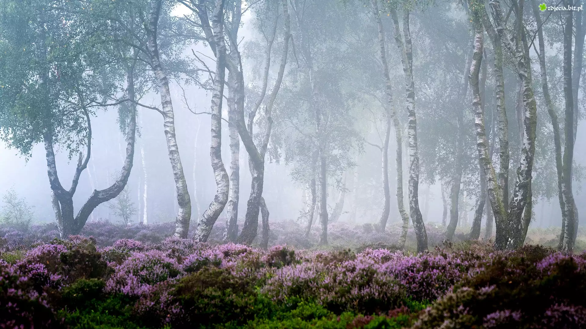 Zdjęcie Drzewa, Las, Brzozy, Mgła, Wrzosowisko, Wrzosy, Park Narodowy Peak District, Hrabstwo Derbyshire, Anglia |