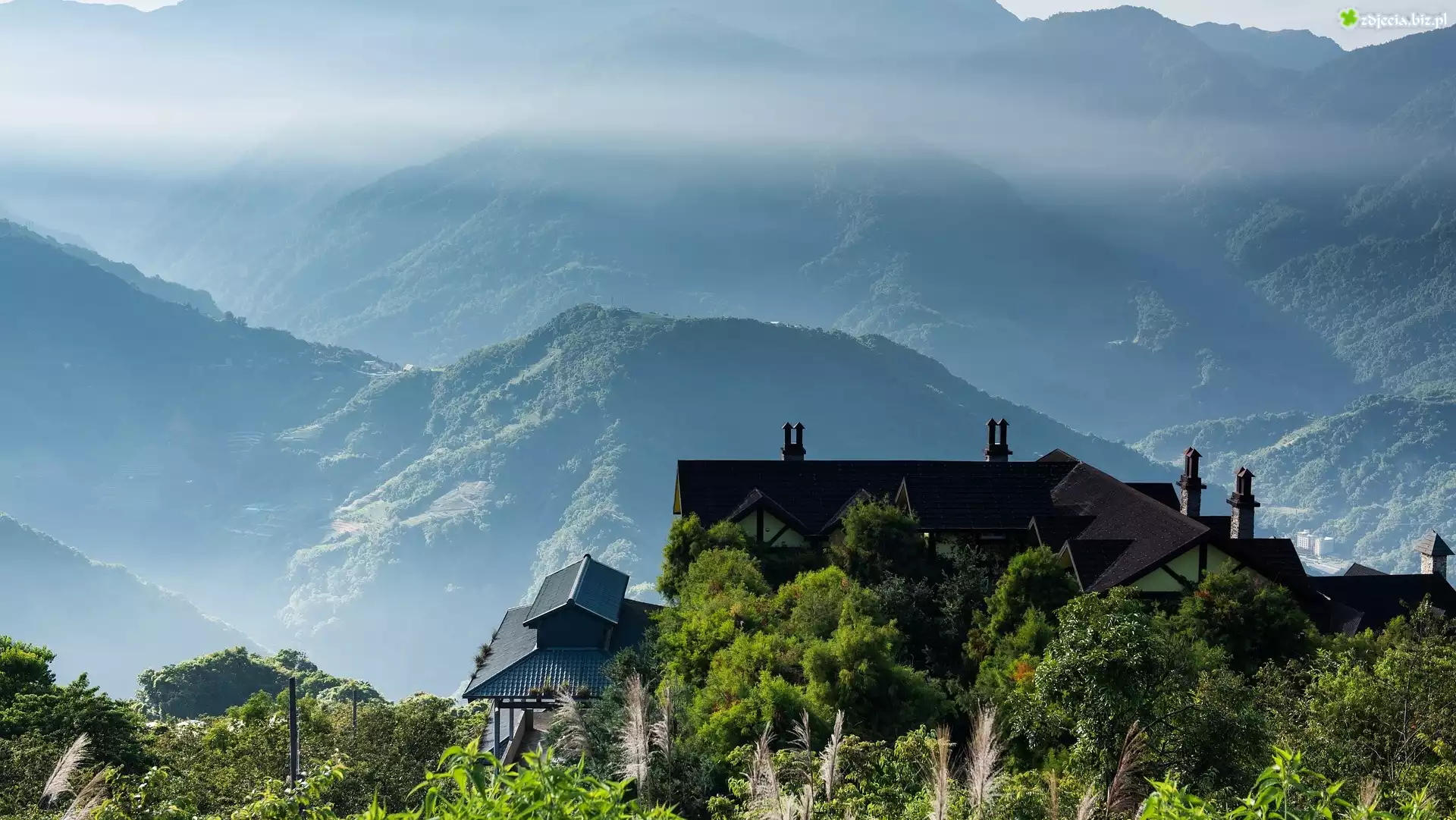 Zdjęcie, Tajwan, Hrabstwo Nantou, Qingjing Farm, Góry, Dom, Mgła, Drzewa
